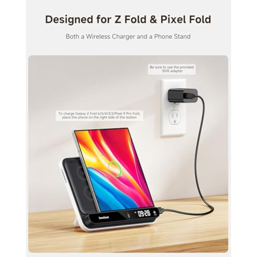 | Wireless Charger For Pixel Fold Z Fold -The 504F Is Meticulously Designed For Z Fold Series Users. It Perfectly For Samsung Galaxy Z Fold 6/5/4/3, And For Google Pixel 10 Pro Fold/Pixel 9 Pro Fold/Pixel Fold. | | Fast Charging: Charge Phones At Up To 10W With The Included 30W Adapter, Achieving 80% Capacity For Galaxy Z Fold 5 In 2 Hours, Even With Cases (Up To 0.2" Thick). No Need To Remove Your Phone Case For Wireless Charging. | | Charging Status Dimmable Clock: Watch Your Devices Charge While Tracking Time: The Led Display Shows Both. First Tap The Surface To Adjust Clock Brightness (4 Levels), And Easily Switch 12/24 Time Formats To Suit Your Routine. | | Dual-Mode Charging Base: Stand Phones Verti