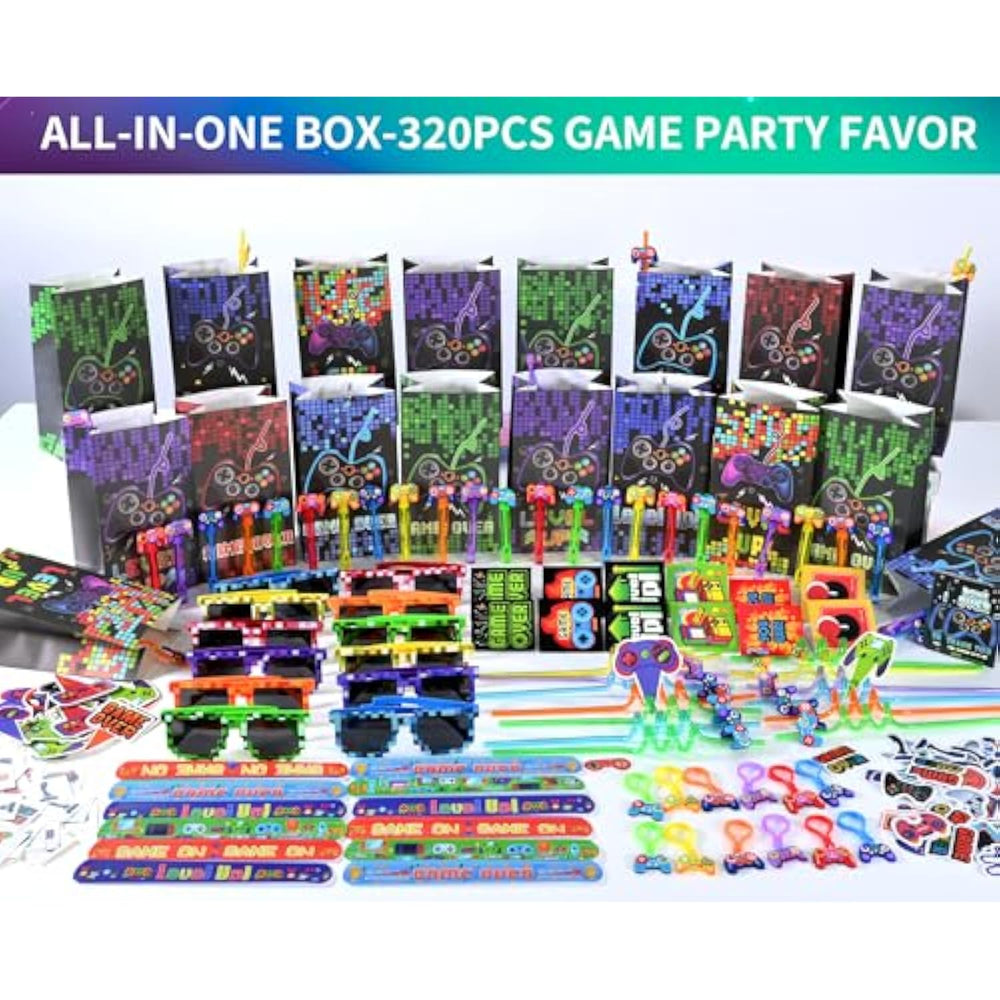 | Complete Video Game Party Kit: Everything For An Epic Gaming Party: 12 Themed Goodie Bags, 12 Party Glasses, 12 Crazy Straws, 12 Bubble Wands, 12 Keychains, 12 Mini Notebooks, 12 Slap Bracelets, 12 Thank-You Cards, 24 Cake Toppers, 100 Stickers 100 Tattoo Stickers | | Ultimate Party Decorations Bundle:?Transform Any Space With Vibrant, Kid-Approved Designs! Each Item Features Popular Video Games And Pixel Art Perfect For Decorations, Pinata Fillers, Or Game-Themed Activities | | Huge Value, Save Time Money: 320 Ready-To-Use Pieces In One Budget-Friendly Bundle! Skip Expensive Separate Purchases - Get Decorations, Favors, And Entertainment Supplies Instantly | | Premium Quality Material: Durable Materials, Every Item Rigorously Tested For Safety And Lasting Fun—Ideal For Party Favors, Classroom Prizes, Or Gift Bags | | Unforgettable Kids' Party Experience: Create Photo-Worthy Moments With Interactive Accessories! Kids Love The Party Glasses, Bubble Wands, Crazy Straws, And Collectible Tattoos—Perfect For Birthdays, Game Nights, Or Special Events | |