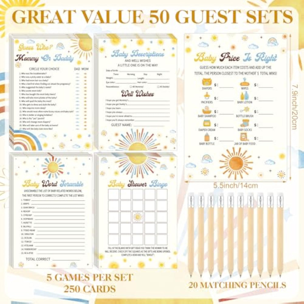 | Sufficient Quantity: You Will Receive 1 Set Of Here Comes The Son Theme Don'T Say Baby Shower Game Supplies Including 1 Piece Of Wooden Don'T Say Baby Sign, 50 Pieces Of Wooden Clothespins, 250 Pieces Of Baby Shower Cards And 20 Pieces Of Pencils, 321 Pieces In Total, Which Will Meet Your Party Needs | | Here Comes The Son Themed: Retro Sun Theme Baby Shower Games Sets In Bulk Feature The Sunshine Style And Are Characterized By Relevant Words And Boho Themed Patterns, Such As Sun And Rainbow Patterns, Eye Catching And Delicate, Bringing Much Fun To Your Parties | | Reliable And Durable: This Here Comes The Son Theme Baby Shower Sign Is Made Of Quality Wood And Printed With Clear Patterns, Smooth And Vibrant With No Burrs; Here Comes The Son Theme Baby Shower Activities Cards Are Made Of Paper Material, Bright And Thick, Safe And Reliable To Use; The Pencils And Small Clips Are Mainly Made Of Wood, Sturdy And Can Be Applied With Confidence | | Proper In Size: This Don'T Say Baby Game Stand Sign Measures Approx. 5.12 X 7.87 X 0.2 Inches And These Clothespins Are About 1.54 X 0.79 Inches, Ideal In Size For Decorating Needs; The Beautifully Crafted Gender Neutral Games Supplies Are Lightweight And Convenient To Store And Carry Around | | Wide Range Of Use: The Hilarious Baby Shower Game Supplies Are Funny And Meaningful Choices For Baby Showers, Birthday Parties, Gender Reveal Parties, Family Gatherings And Other Occasions, Creating A More Cheerful Atmosphere And Leaving You And Your Guests With Unforgettable Memories | |