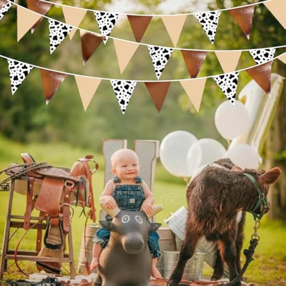 | Cotton | | Package Including:1 Pack Western Cowboys Theme Fabric Bunting Banner Garland In Metallic Brown, Nude And Cow Printed Colors, With 36Pcs Flags In 10M/32.8Feet. Flag Size: 5.5In Width X 7In Height. | | Material: Longlife-Hand-Made Black And White Cow Printed Pennant Banner Made Of Strong Weatherproof Cotton. Washable And Reusable For Many Times, Soft And Comfortable Touch. | | Easy Using: The Western Cowboy Party Flag Banners Are Very Easy To Hang And Decorate Both Inside And Outside, Like Home, Wall, Bedroom, Dining Room, Ceiling, Fireplace, Window, Garden, Branches, Fences, Restaurants, Bars | | Cow Party Choice: These Brown And Cow Printed Triangle Flags Are Good Ideal For Any Kind Of Celebration, Party, Festival, Events Or Other Occasion. It Can Be Used By Both Kids And Adults. Like Cow Party, Western Party, Farm Party, Go Wild Party, Animal Party, Dance And Picnic Party, Derby Day, Cowboy Party, Teddy Bear Party, Woodland Party, Wedding, Birthday, Baby Shower, Nursery Christening, Family Gatherings, Outdoor Activities, Picnics, Bbqs Carnivals, Tea Party,Dinosaur Parties, Coffee Brown Party, Thanksgiving Etc. | |