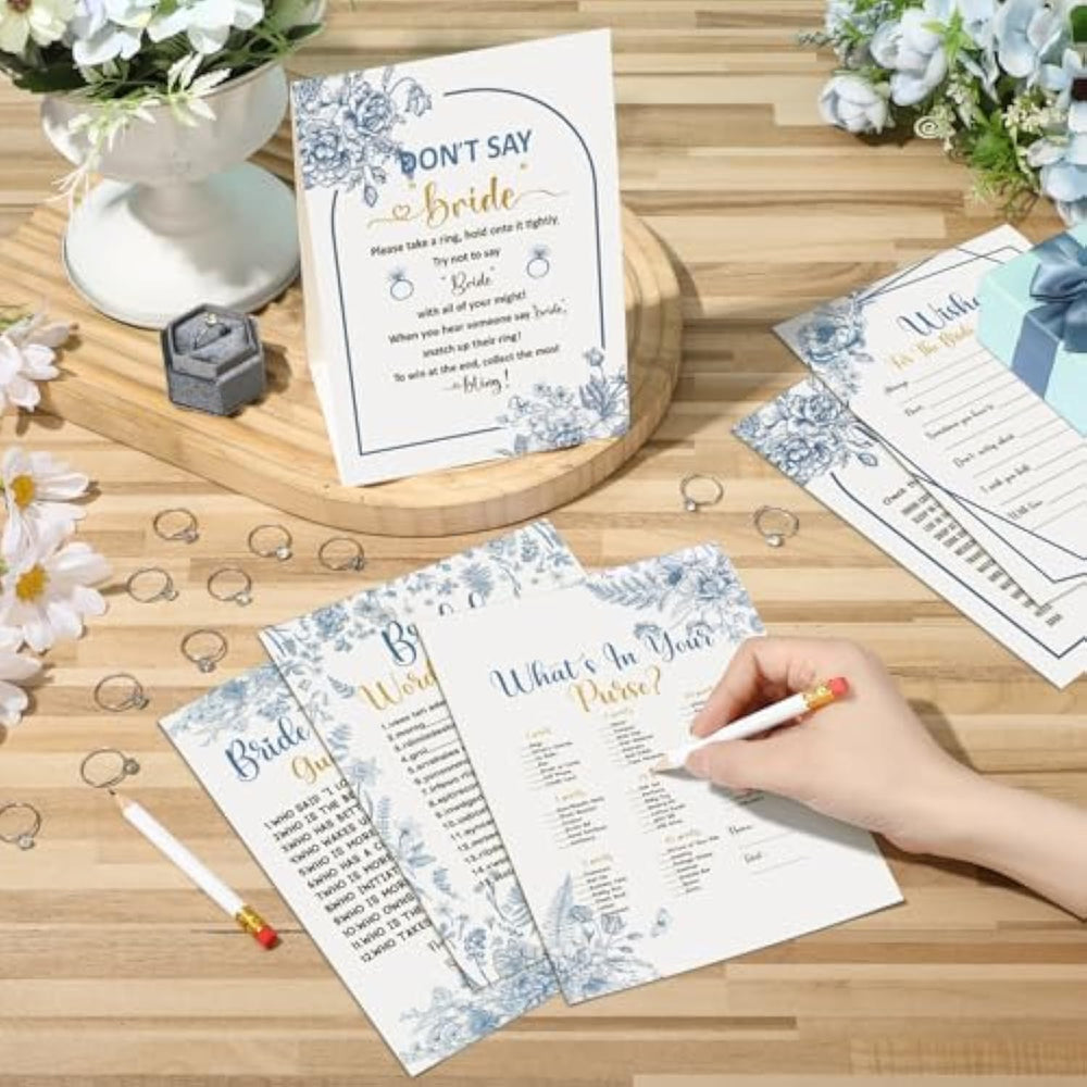 | Funny Bridal Shower Games: You Will Be Provided With 250 Pieces Of Wedding Games Cards, 1 Piece Of Wedding Sign, 60 Pieces Of Rings And 20 Pieces Of Pencils, Sufficient Quantities Can Entertain Your Families And Guests In Bridal Shower | | Enough Wedding Games: The Bridal Shower Games 50 Guests Allow You To Play 6 Games With Your Guests Namely Would She Rather, Words Scramble, Wishes, What'S In Your Purse And Put A Ring On It, Interesting To Make Your Guests Laugh | | Quality And Reliable: The Wedding Games Cards Are Made Of Paper, Quality And Reusable To Serve You For A Long Time, Measuring Approx. 7.87 X 5.51 Inches/ 20 X 14 Cm, The Pencils Are Made Of Wood And Are Approx. 4 Inches, The Bridal Shower Rings Are Made Of Alloy, Adjustable And Lightweight To Wear | | Applicable Wedding Party Game: The Wedding Shower Games Will Be Ideal For Wedding Showers, Bridal Showers, Engagements, Proposals, Anniversaries, Bachelorette Parties And Other Celebrations, Which Will Quickly Elevate The Party Atmosphere | | Delicate And Classic: The Put A Ring On It Bridal Shower Games Are Designed Mainly In Blue And White Colors, Clearly Printed And Full Of Blue Floral Patterns, And They Can Meet The Aesthetics Of Most People | |