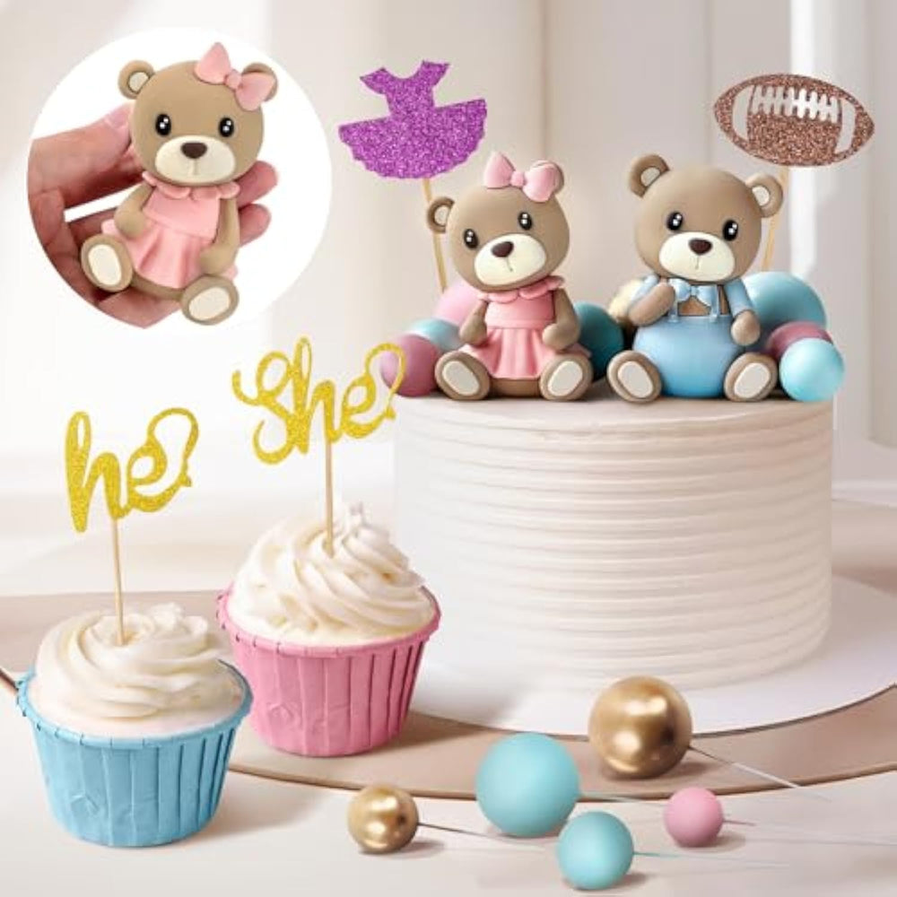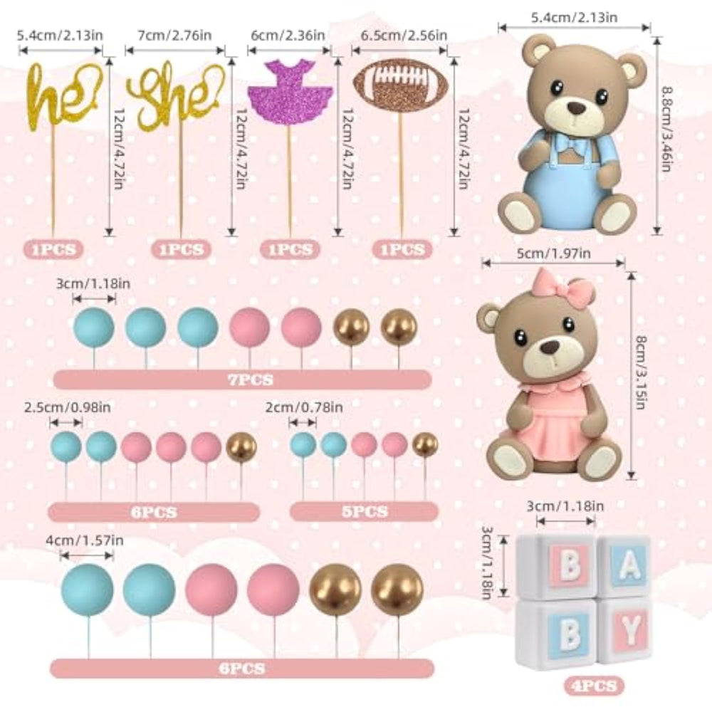 | Gender Reveal Cake Topper Set: You Will Get 2 Pieces Bear Cake Toppers, 1 Set (4 Pieces) Of He Or She Cake Topper, 1 Set (4 Pieces) Of [Baby] Square Cake Topper, 9 Pieces Blue Ball Cake Toppers, 9 Pieces Pink Ball Cake Toppers And 7 Gold Ball Cake Toppers, 34 Pieces In Total | | Safe Material Reusable: The Bear Cake Topper And Baby Letter Square Cake Decorations Are Made Of Resin, The Balls Are Foam, He Or She Cake Topper Are Made Of Paper, The Gender Reveal Cake Topper Is Safe, Reliable, And No Odor, Not Easy To Break Or Tear | | Easy To Use: The Gender Reveal Cake Topper Are Ready To Use Right Out Of The Box. No Assembly Is Required, Simply Insert Them Into The Desired Location On Your Cake. This Saves You Time And Effort, Allowing You To Effortlessly Decorate Your Cakes | | Variety Of Cake Topper Elements: These Gender Reveal Cake Topper Decorations Can Be Applied For A Variety Of Occasions, Such As Gender Reveal, Birthday Party, Wedding, Baby Shower, Anniversary Etc | | Applicable Scene: You Can Create Surprises For Your Friends Or Dear Family Members, And Decorate Your Party'S Cakes, Desserts, Pastries Etc | |