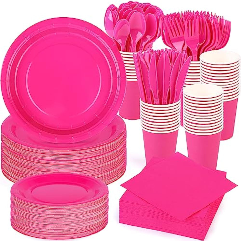 This 350-piece hot pink dinnerware set includes 50 paper cups (9 oz), 100 paper plates in 7-inch and 9-inch sizes (50 each), 50 napkins (13 x 13 inches unfolded), and 50 sets of cutlery, providing everything needed to serve 50 guests. The elegant hot pink design adds a stylish touch to any pink-themed event. Durable and suitable for both hot and cold food, this disposable set makes cleanup effortless, allowing more time to enjoy birthdays, weddings, and other celebrations.