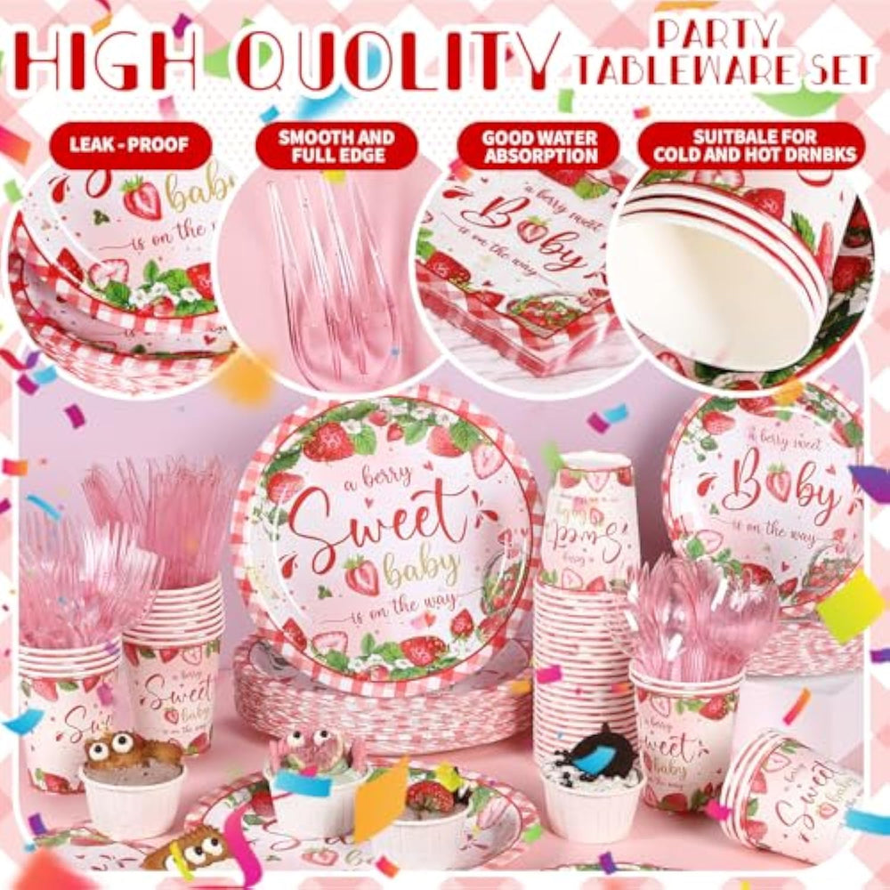 | Complete Set: Includes 50 Dinner Plates, 50 Dessert Plates, 50 Cups, 50 Forks, 50 Spoons, 50 Knives, And 50 Napkins For A Full Party Service Of 50 Guests | | Charming Design: Features A Beautiful Strawberry Theme With "A Berry Sweet Baby Is On The Way" Text, Adorned With Fresh Strawberries And Delicate Floral Accents | | Premium Quality: Sturdy Paper Plates, Cups, And Utensils Ensure Reliable Performance Throughout Your Baby Shower Celebration | | Coordinated Look: All Pieces Feature Matching Strawberry Motif In Red And Green Colors With Gold Accents For A Cohesive Party Presentation | | Convenient Size: Dinner Plates Measure 9 Inches, Dessert Plates 7 Inches, Cups Hold 9 Ounces, Perfect For Serving All Your Party Refreshments | |
