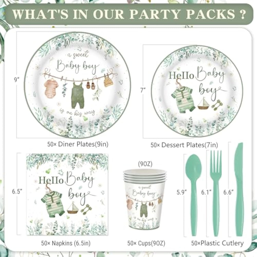 | Complete Set: 350-Piece Baby Shower Party Supplies Pack Includes Plates, Cups, Napkins, And Plastic Cutlery For Up To 50 Guests | | Charming Design: Sweet Baby Boy Themed Pattern Featuring Clothesline Motif With Adorable Onesies And Baby Clothes In Soft Green And Brown Tones | | Party Plates: Includes Both Dinner And Dessert Plates With Coordinating Greenery Border Design And 'Hello Baby Boy' Message | | Table Essentials: Matching Cups And Napkins Feature The Same Delightful Baby Clothes Design Theme For A Cohesive Look | | Convenient Planning: All-In-One Party Supply Solution Eliminates The Need For Multiple Purchases, Perfect For Baby Shower Hosting | |