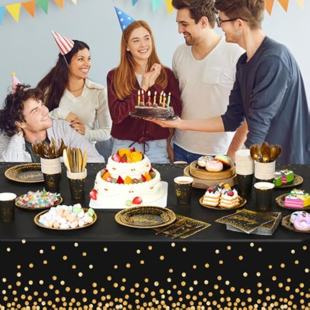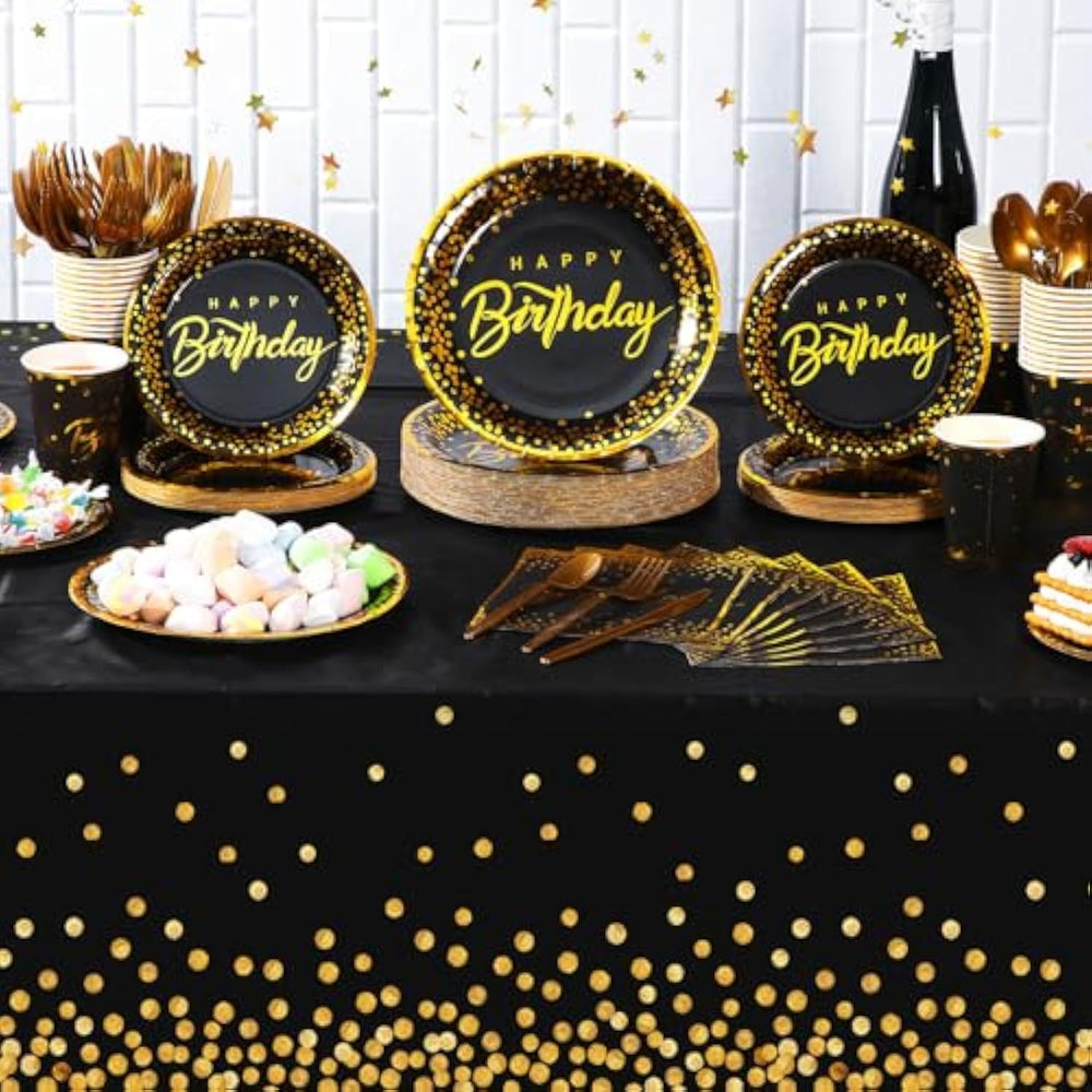 Disposable Party Tableware Set: This Happy Birthday Party Supplies Can Be Applied For 50 Guests, Including 50 7-Inch Plates, 50 9-Inch Plates, 50 Plastic Cutlery Sets (50 Knives, 50 Forks, 50 Spoons), 50 9Oz Paper Cups, 50 Paper Napkins (3 Ply, 6.5" X 6.5"), And 2 Waterproof And Oil Resistant Peva Tablecloths | Quality Material: Birthday Disposable Plates, Cups And Napkins Are Made Of Thick Paper, Not Easy To Fold, Tear Or Break, Napkins Are Soft And Absorbent; Forks, Spoons And Knives As Well As Tablecloths Are Made Of Plastic, Sturdy And Durable, Easy To Wipe Clean, Can Reuse Multiple Times; Note: Do Not Heat Plates And Cups In The Microwave | Delicate Birthday Design: Our Entire Birthday Dinnerware Set Is Dominated By Black And Gold; The Plates, Paper Towels And Cups Are All Designed With Golden Happy Birthday, Gold Foil Polka Dots And Gold Edges; The Cutlery, Forks And Spoons Are All Matching Gold, And The Hem Of The Tablecloth Is Also Designed With Gold Foil Polka Dots; These Element Designs Can Make Your Birthday Party More Low Key, Luxurious And Elegant | Save Cleaning Time: These Birthday Disposable Plates And Napkins Are Made Of Disposable Recycled Paper, So You Can Throw Them Away After Use, Making It Possible To Quickly Clean Up The Mess After The Party, Saving Time And Energy; Having More Time To Enjoy The Party Is The Ideal Choice For A Birthday Party | Suitable For All Ages: These Birthday Plates And Napkins Party Supplies Are Suitable For Birthday Parties Of All Ages And Occasions, Such As Boys And Girls Birthday Parties, Men And Women Birthday Parties, Grandparents Birthday Parties, And Birthday Parties For Family, Colleagues, And Friends And So On |