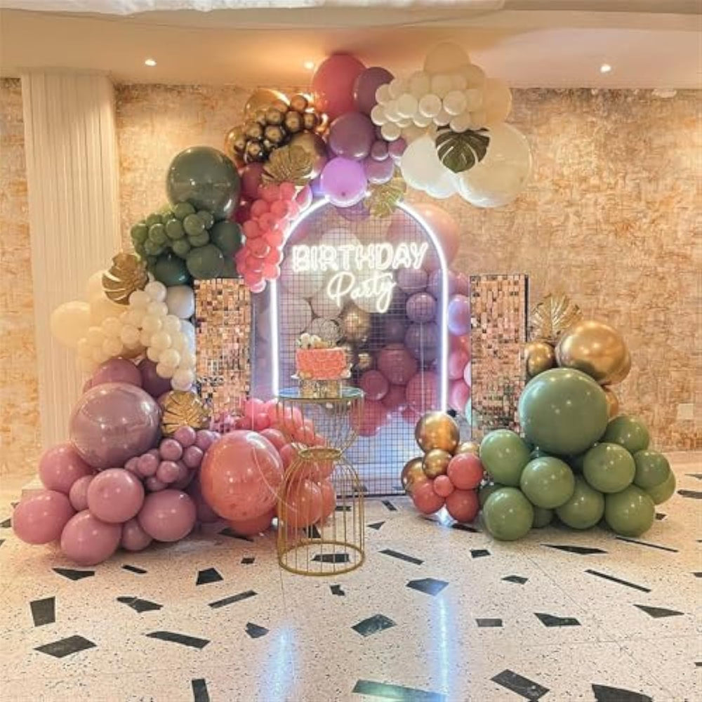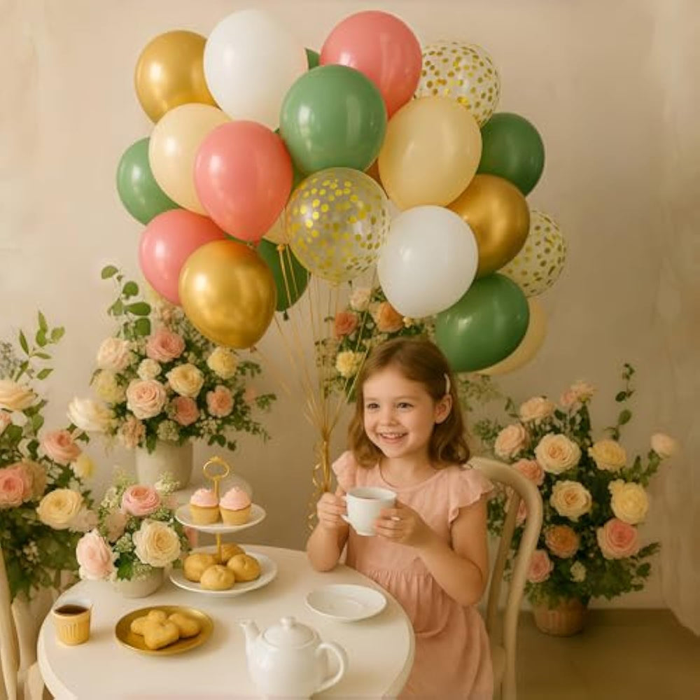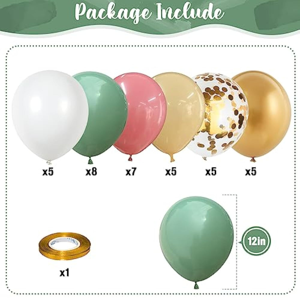 This 35-piece dusty green pink gold balloon set includes 12-inch latex balloons in olive sage green (8pcs), retro dusty pink (7pcs), apricot (5pcs), matte white (5pcs), metallic gold (5pcs), and gold confetti (5pcs), along with a gold balloon ribbon, making it perfect for jungle, safari, birthday, baby shower, bridal shower, or wedding decorations. Made from 100% natural latex, these high-quality balloons are thick, durable, and safe for children. They can be filled with air or helium and are best inflated with a pump. For confetti balloons, gently shake and rub them with fabric or hair to enhance their look.