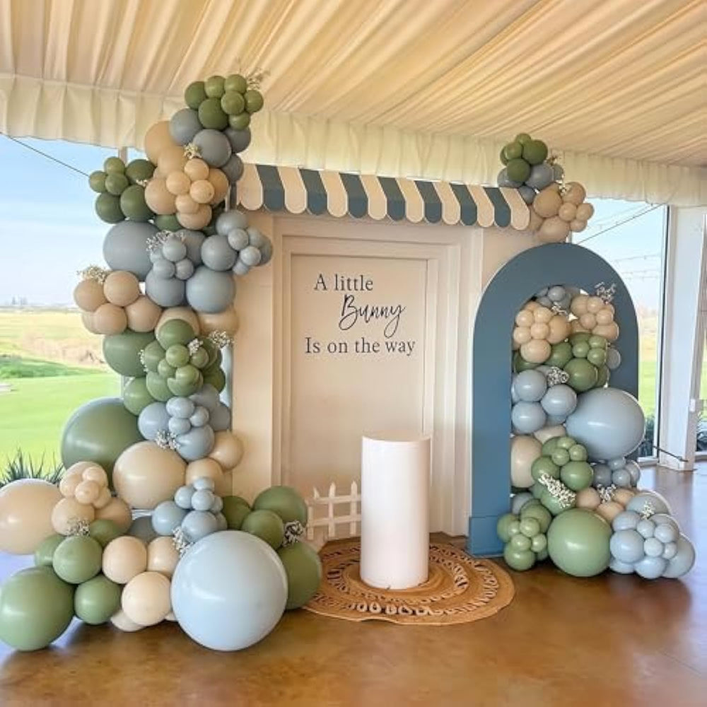 This dusty blue and sage green party balloon set includes 35 helium-quality 12-inch balloons—12 sage green, 7 pastel blue, 6 baby blue, and 10 ivory sand white—along with one roll of light blue ribbon. These color-coordinated balloons are perfect for creating balloon arches, bouquets, backdrops, or room decor. Whether you're decorating for a baby shower, birthday, wedding, gender reveal, or woodland or boho-themed celebration, these balloons help set a joyful and festive atmosphere. For a more impactful setup, consider using two or more sets to enhance your decorations.