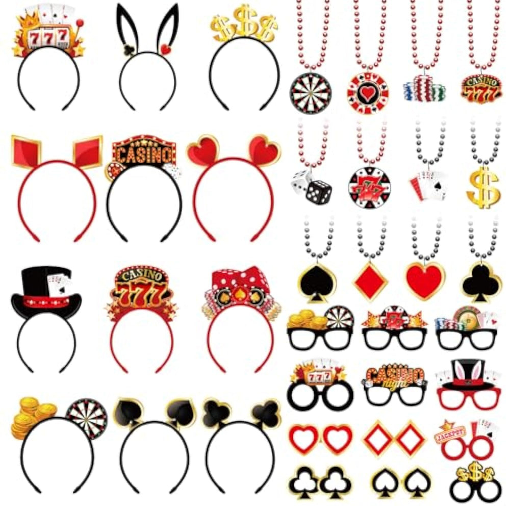 | Casino Night Party Favors: 36 Pieces Casino Accessories In 36 Different Styles, Including 12 Casino Night Beaded Necklaces, 12 Casino Headbands, 12 Casino Glasses, Sufficient Quantity And Novelty Design Can Meet Your Casino Themed Party Wearing And Decorative Demands | | Reliable Material: These Casino Dice Dollar Sign Necklace Pendants, Glasses And Headbands Are Made Of Quality Plastic And Felt, Lightweight And Long Lasting, The Poker Party Favors Can Be Applied Repeatedly For A Long Time And Non Toxic, Not Easy To Fade And Safe To Wear, Provide You A Comfortable Wearing Experience | | Casino Theme Design: These Casino Birthday Party Favors Supplies Are Designed With Classic Casino Theme Patterns, Such As Casino Chips, Poker, Dice, Poker, Dollar Symbols, Spades, Hearts And More, Realistic Shape And Bright Colors, Ideal For Casino Birthday Decorations, Poker Party Decorations | | Suitable Size: Each Casino Theme Necklace Is About 15.75 Inch/ 40 Cm, Pendant Is About 2.76 Inch/ 7Cm High, Glasses Are About 5.51 Inch/ 14 Cm, And Headwear Is About 5.51 Inch/ 14 Cm In Width And 7.87 Inch/ 20 Cm In Height; The Size Is Suitable For Men, Women Or Most Age Groups, Bringing You A Comfortable Wearing Experience | | Ideal Casino Gifts: These Casino Necklaces, Glasses, Headbands Are Fantastic Photo Prop For Casino Theme Parties, Suitable For Las Vegas Game Night Birthday Decorations, Casino Night Party Supplies, Casino Theme Party Decorations, Black And Red Parties, Poker Parties, Create A Entertainment Atmosphere For You | |