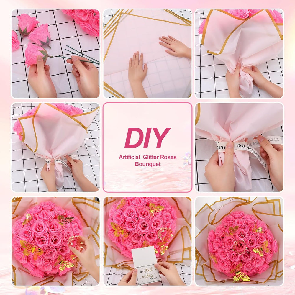 | Stunning Pink Glitter Roses Bouquet: Featuring 36 Premium Sparkling Artificial Roses Designed For Wedding Bouquets, Mother’S Day, Proposals, And Romantic Occasions With A Luxurious Glitter Coating That Mimics The Elegance Of Real Flowers While Being Reusable | | Complete Diy Flower Arrangement Kit: Includes 40 Flexible Flower Rods For Customizable Designs, 12 Decorative Butterfly Embellishments, 1 Dazzling Glitter Crown For Bridal Or Party Accessories, 10 Wrapping Paper, A 30-Meter Satin Ribbon, And 2 Greeting Cards For A Ready-To-Gift Solution | | Exclusive Anti Mess Tablecloth: Ensures Hassle Free Crafting By Preventing Glitter Fallout During Assembly, Keeping Your Workspace Clean Without Sacrificing The High-Shine Sparkle Of These Glitter Roses | | Versatile Fake Flowers: Perfect For Wedding Centerpieces, Bridal Bouquets, Graduation Ceremonies, And Birthday Decor With Flexible Wire Stems That Allow Easy Shaping For Floral Arrangements, Hairpieces, Or Decorative Accents | | Premium Packaging: Making This Pink Glitter Bouquet Ideal For Gifting Or Event Decor With No Wilting Or Maintenance Required | |
