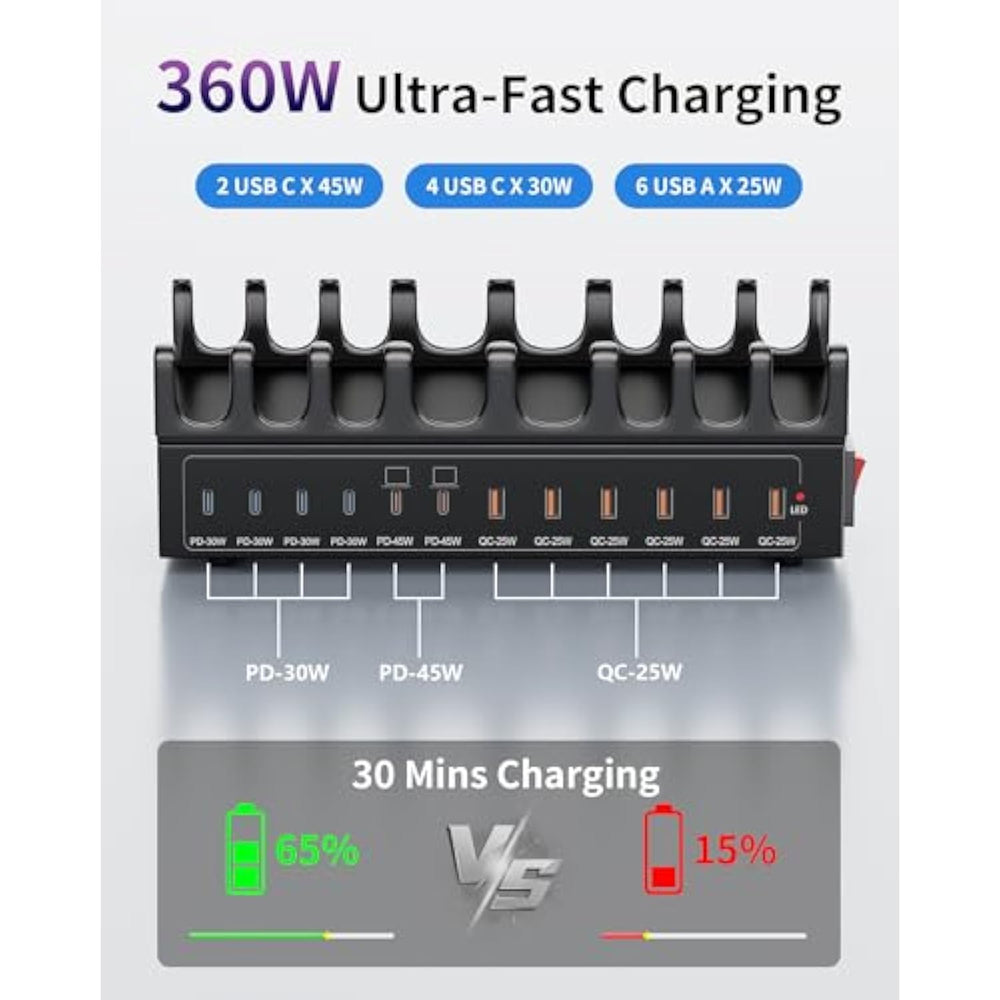 | ?12 In 1 Charging Station?Our Premium Charging Station Integrates 6 Usb-C Ports And 6 Usb-A Ports To Seamlessly Support All Your Modern Devices, Delivering A Total Output Of Up To 360W For Efficient Fast Charging Of Up To 12 Usb Devices Simultaneously. Eliminate Tangled Cables And The Need For Multiple Wall Chargers, Creating A Peaceful, Organized Workspace That Simplifies Your Daily Routine | | ?Total 360W Output?Charging Station For Multiple Devices Equipped With 4 Usb-C (30W Max) + 2 Usb-C(45W Max) And 6 Usb-A (25W Max) Power Supply.Simultaneously Fast-Charge 12 Devices With Total 360W. With Smart Charging Technology, It Automati