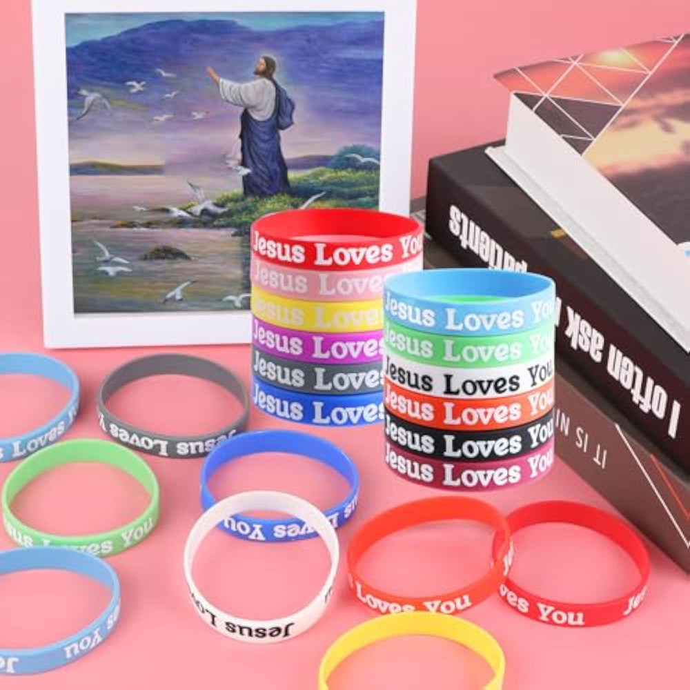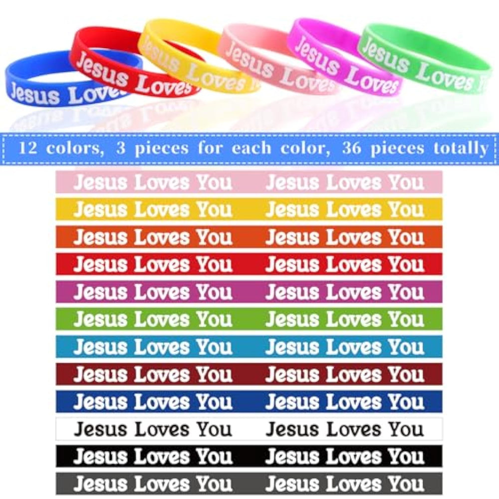 | Value Package: You Will Get 36 Pieces Jesus Loves You Bracelets In 12 Different Colors Including Yellow,Red, Orange, Green, Blue, Purple And So On. Exquisite And Colorful, Various Styles And Sufficient Quantity To Meet Your Party Need. | | Premium Material: All Inspirational Bracelet Wristbands Are Made Of High-Quanlity Silica Gel Material, Non-Toxic And Stretchable, Durable And Elastic. Because Of The Premium Silicone Material, It Is Soft And Safe Enough For You. | | One Sizes Fits All: The Silicone Bracelets Measure Approx. 2.63 Inches In Diameter And 0.5 Inch In Width, Prefect Size For Kids Teenager. And The Wristbands Also Fits The Most Adults Because Of The Stretchy Material. They Can Be Stretched To The Right Size. | | Bright Eye-Catching Desgin: These Wristbands Are Printed Clearly With The Inspirational Word"Jesus Love You" And Designed In 12 Different Colors. Eye-Catching And Unique?Christian Silicone Bracelet With Cross Elements Can Show And Inspire You And Others To Have A Strong Faith In God And Spread The Gospel | | Wide Application: The Bracelets Look Great, Not Only Suitable For Casual Wear, But Also Very Suitable For Occasions Such As Church Fundraising Activities And Youth Groups.Ideal Gift For Family, Friends, Colleagues, And Church Members, Also Can Be Used For Fundraising, And Publicity Events, Which Can Express Your Sincere Wishes And Give Them Heartfelt Encouragement. | |