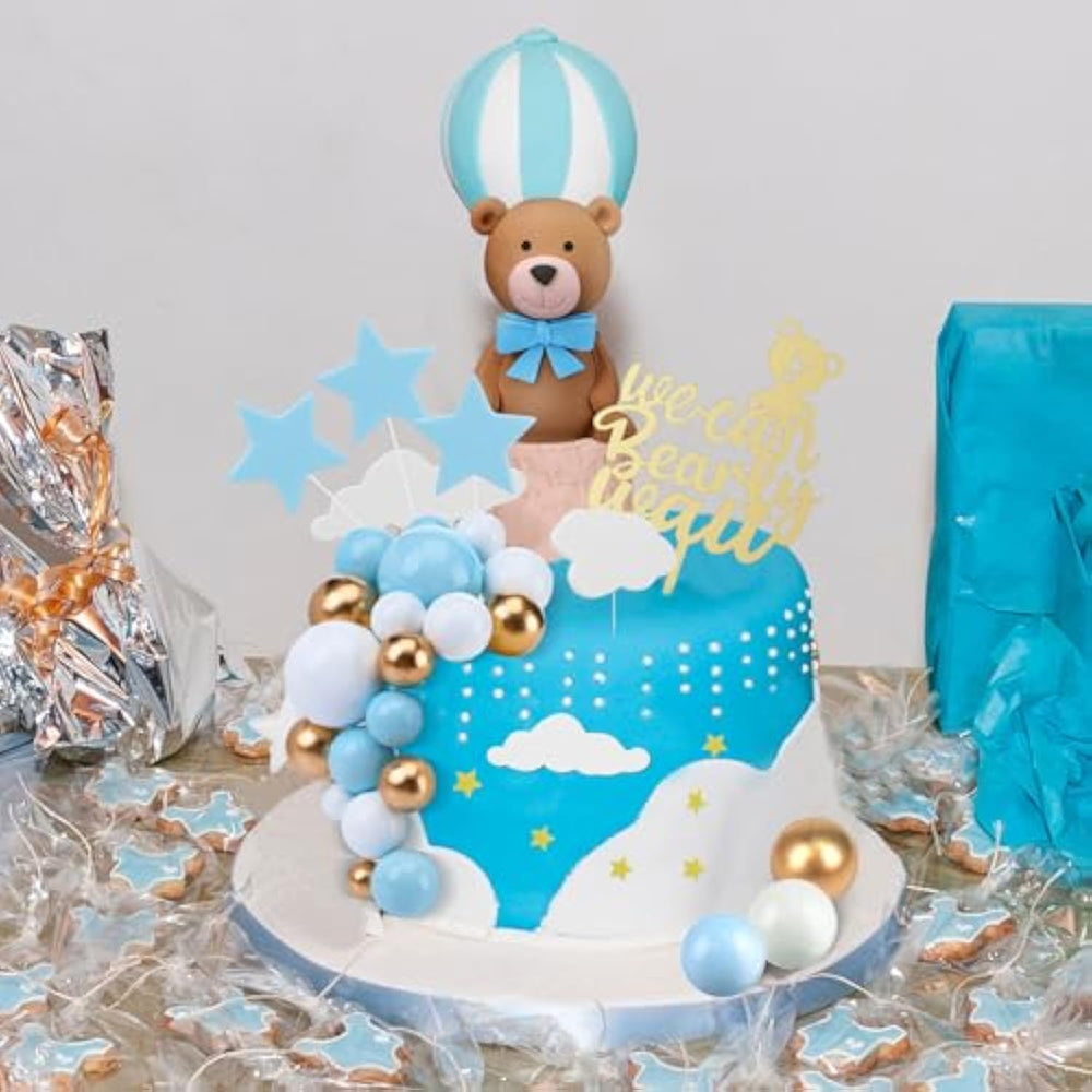 | Bear Baby Shower Decoration Set: Package Includes 37 Pieces Of Bear Balls Cake Toppers Set, Containing 1 Piece Of We Can Bearly Wait Cake Topper, 23 Pieces Of Cake Balls Decorations (With 3 Colors), 1 Piece Of Bear Cake Topper, 6 Pieces Of Clouds Cake Toppers And 5 Pieces Of Stars Cake Toppers, And 1 Ladder Decoration; Sufficient Quantity And Nice Combination To Meet Your Various Decorative Demands | | Adorable Size: The Size Of The Bear Topper Is About 2.95 Inches, And The Size Of The Cake Topper We Can Tolerate Is About 2.5 - 3 Inches. 6.69 X 4.72 Inches; The Cake Ball Decorations Come In 5 Sizes, Namely 1.57 Inches, 1.18 Inches, 0.98 Inches, 0.79 Inches And 0.59 Inches; The Width Of The Cloud Decoration Is About 2.36 - 3.54 Inches, And The Width Of The Star Decoration Is About 2.36 - 3.54 Inches. 6.69 Inches High | | Quality Material: The Bear Cake Decorations Are Made Of Quality Pvc Material, We Can Bearly Wait Cake Topper Adopts Acrylic, The Colorful Balloons Balls Cake Toppers, Clouds And Stars Are Made Of Quality Eva Foam, Lightweight And Reliable, Can Be