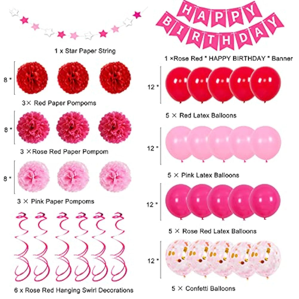 This pink birthday decoration set is perfect for women and girls of all ages, including milestones from 1st to 60th birthdays. The package includes a pink "HAPPY BIRTHDAY" banner, star string, 10M ribbon, 9 paper pompoms in rose red, red, and pink, 6 rose red hanging swirls, 5 confetti balloons, and 15 latex balloons in matching colors. Made from premium quality latex and foil, these decorations are durable, environmentally safe, and easy to inflate. The vibrant colors are ideal for both indoor and outdoor setups, making them perfect for a variety of celebrations, from intimate gatherings to grand parties.