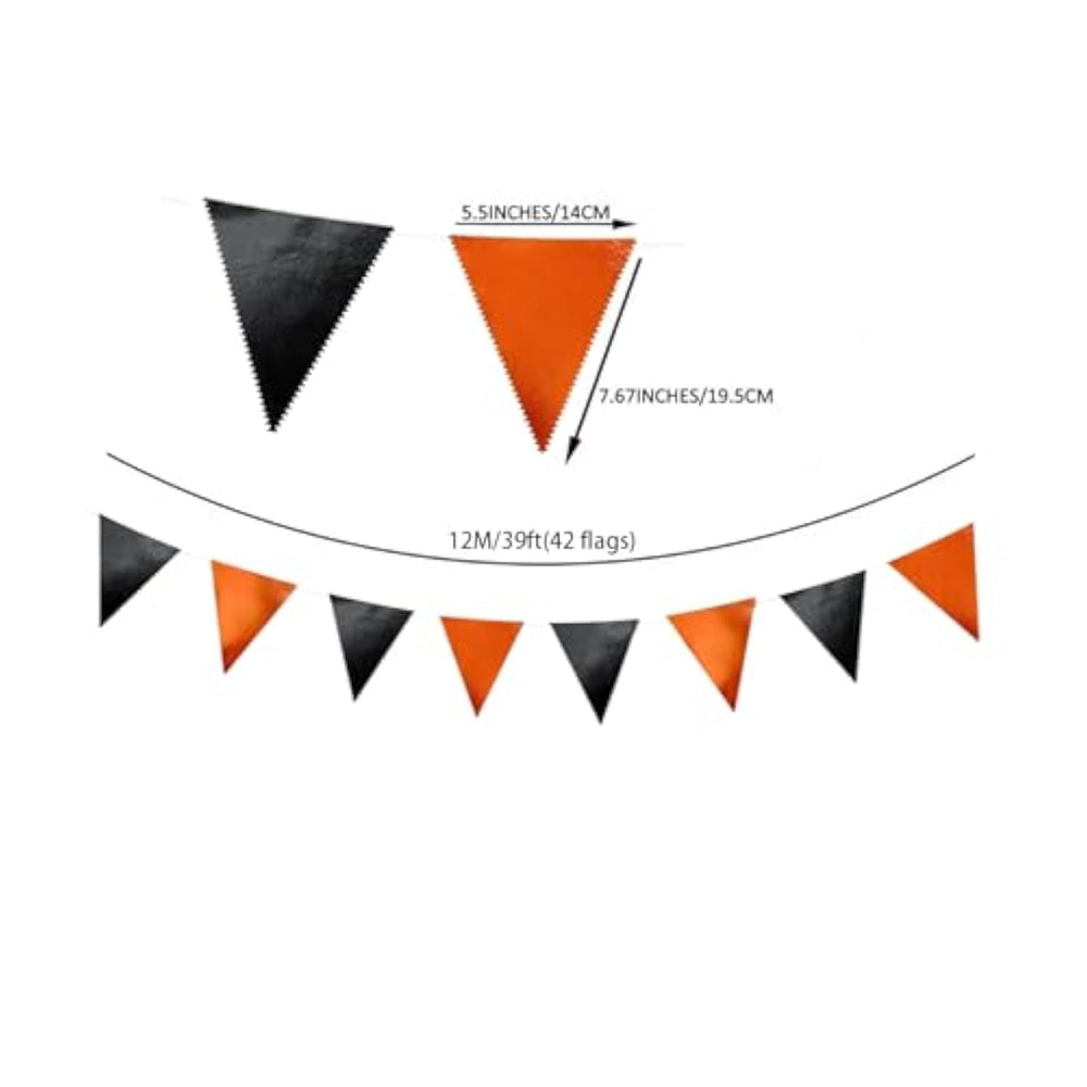 This set includes a 12M/39ft black and orange glitter fabric pennant banner with 42 triangle flags, each measuring 14cm x 18cm. Made from high-quality double-sided glitter cotton in black and orange, the banner is durable, reusable, and adds a vibrant touch to any party. The included rope makes it easy to hang on ceilings, walls, doors, tables, windows, fences, or branches. Perfect for Halloween, birthdays, weddings, showers, graduations, picnics, or other indoor and outdoor events, it also works well as garden, classroom, or photo decoration.