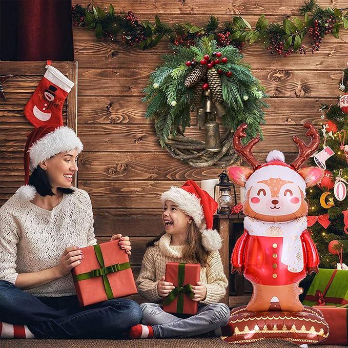 This 3D Standing Reindeer Foil Balloon measures 59 × 26 inches and features an adorable Christmas-themed design with a Santa hat, red coat, and snowflake scarf, making it a lively centerpiece for holiday décor. Made from premium foil Mylar, it is durable, resistant to breakage, and maintains its shape for long-lasting display, with the option to reuse after deflation. The balloon includes its own stable base, allowing it to stand on tables, floors, or other surfaces without additional support. Perfect for Christmas parties, home décor, reindeer-themed birthdays, school events, or festive photo props, its detailed antlers, snowflakes, and holiday patterns bring a cheerful and three-dimensional Christmas atmosphere to any space.