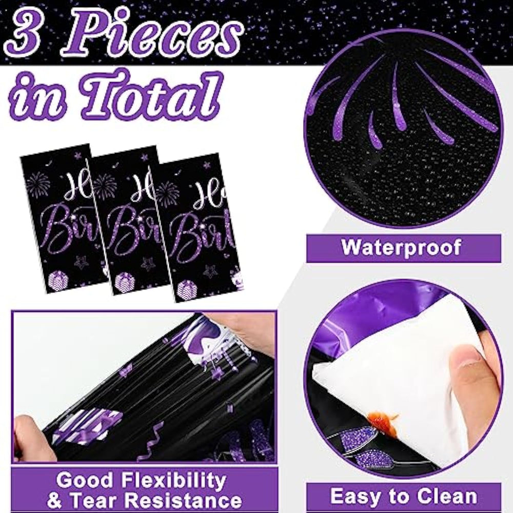 The package includes 3 black and purple "Happy Birthday" tablecloths, perfect for your birthday party needs. Each tablecloth measures 54 x 108 inches, making them large enough to fit most rectangular tables or serve as picnic mats. Featuring a fun birthday theme with cakes, balloons, party hats, and gift boxes, the design is accented with gold foil for an eye-catching effect. Made from sturdy, reliable plastic, these tablecloths are waterproof, disposable, and resistant to tearing or fading, ensuring your tables stay clean and saving you time on cleanup after the party.