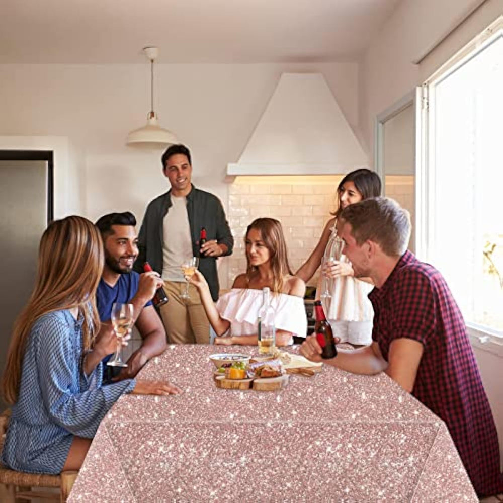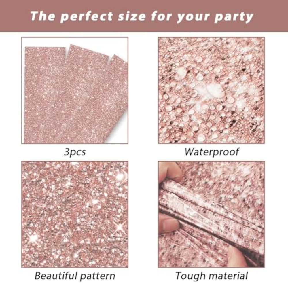 This set includes 3 rose gold sequin tablecloths designed for party decorations with a vibrant and creative look. Made from high-quality PE plastic, they are lightweight, waterproof, and safe, ensuring durability while protecting tables from spills and scratches. Measuring approximately 105 x 54 inches, these table covers fit most rectangular tables, making them ideal for both indoor and outdoor use. Perfect for pink and rose gold-themed parties, they complement banners, plates, and other decor. Suitable for birthdays, baby showers, receptions, and more, they help keep tables clean while enhancing the festive atmosphere.