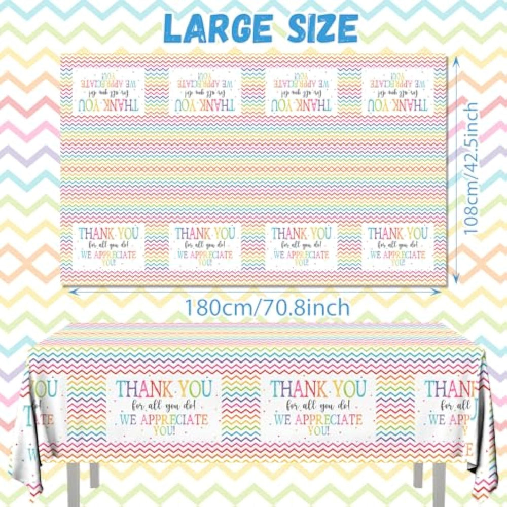 | ?Thank You Theme?Our Thank You Tablecloths Plastic Combine Rainbow Wave Stripes With Colorful Letters “Thank You” “We Appreciate You!”. Fantastic Design Creates A Cheerful Atmosphere For Appreciation Party. | | ?Oblong Table?Includes 3Pcs Rectangular Appreciation Table Cloths That Measure 70.8" X 42.5" (L*W). Big Enough To Cover Most Rectangle Tables Indoor And Outdoor. | | ?High Quality?We Appreciate You Table Cloth Is Made Of Premium Plastic, Which Is Sturdy, Eco-Friendly And Waterproof. Lightweight And Foldable Design Is Portable And Takes Up Small Space. Features Vivid Pattern That Is Printed Clearly. | | ?Occasions?Thankful Table Cloth Is Perfect For Various Thank You Themed Parties And Thanksgiving Party, Such As Employee Appreciation, Staff Appreciation, Teacher Appreciation, Volunteer Appreciation, Pastor Appreciation, Thank You Doctor, Thank You Nurse, Thank You Parents, Thank You For Being A Friend, Thank You For All You Do, Etc. Impress Your Guests And Have An Amazing And Unforgettable Time! | | ?Save Time?Disposable Thanksgiving Tablecloth Is Time-Saving, Simply Throw It Away After Party So That You Can Spend More Time With Family And Friends. | |