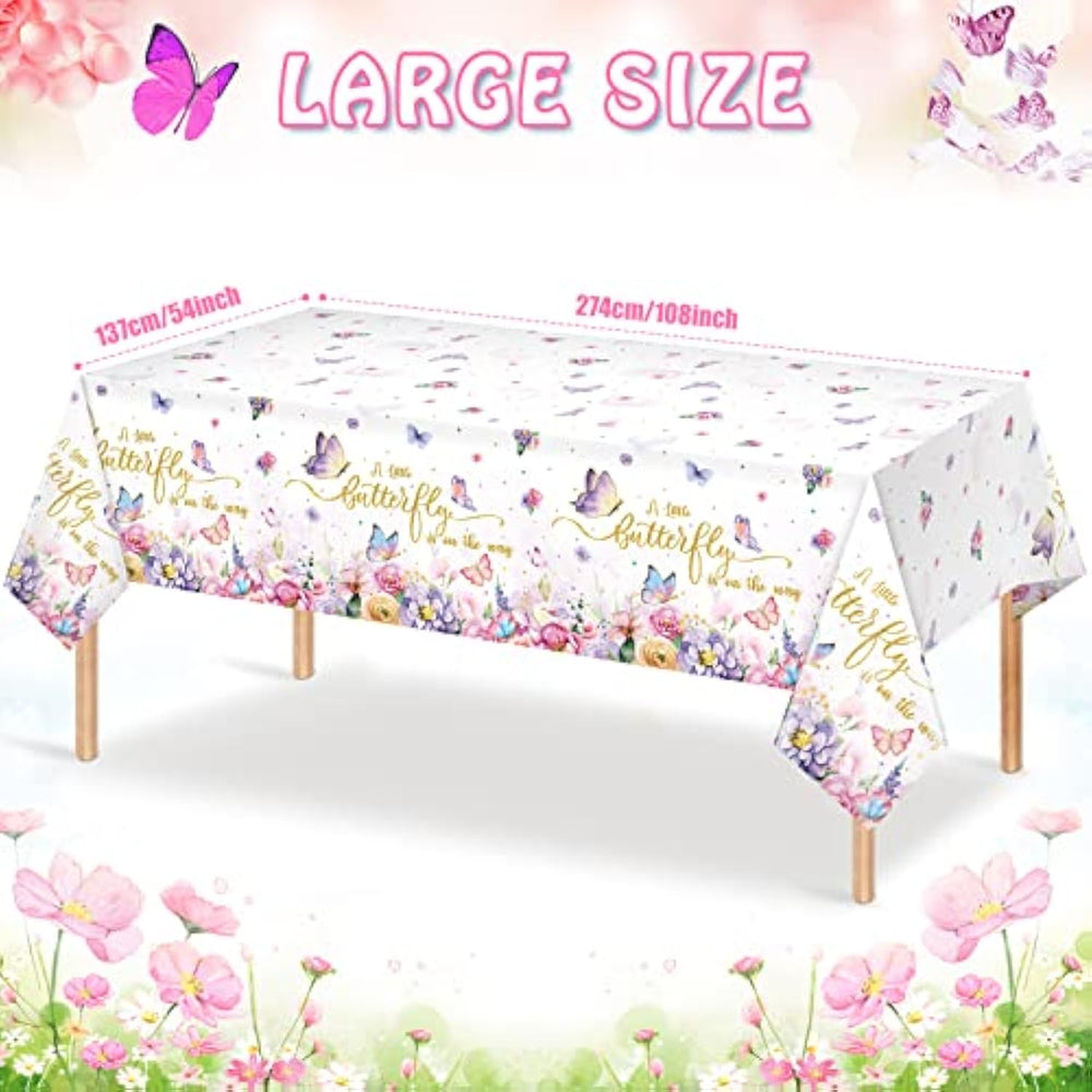 This set includes 4 butterfly baby shower tablecloths each measuring 54 by 108 inches making them large enough to fit most rectangular tables and perfect for both indoor and outdoor use. Featuring a charming design with colorful butterflies flowers and the phrase a little butterfly is on the way these table covers create a warm and joyful baby shower atmosphere. Made from thick high quality PE plastic they are waterproof stain resistant lightweight and durable with clear vibrant printing that won't easily tear. These disposable tablecloths protect your tables from spills and messes and can be simply thrown away after the party saving you time and effort while allowing you to enjoy the celebration with your loved ones.
