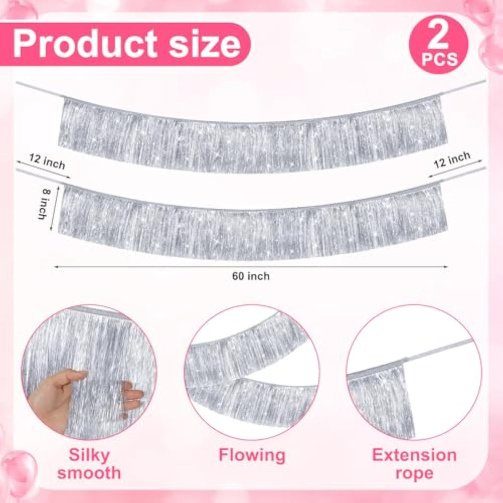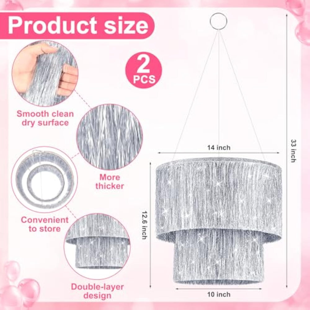 | 4 Piece Tinsel Fringe Decoration Set: You'Ll Receive 2 Pcs Silver 2 Tier Tinsel Fringe Chandeliers And 2 Pcs Silver Iridescent Foil Tinsel Fringe Banners; These Two Versatile Silver Party Decorations Will Create A Dazzling, Eye-Catching Display For Social Gathering, From Birthdays To Bachelorette Parties | | Ideal Size: The Large Hanging Tinsel Chandeliers For Party Decorations Are Each About 33.07 Inches/ 84 Cm High, With The Top And Bottom Diameters Measuring 14 Inches And 10 Inches Respectively; The Tinsel Fringe Length (Excluding The Hanging Cord) Is About 12.6 Inches/ 32 Cm; The Fringe Banners Measure About 7.87 Inches X 78.74 Inches/ 20 Cm X 2 Meters, Making Them Suitable For A Variety Of Indoor And Outdoor Decorating Spaces | | Dazzling Decorations: The Glamorous And Elegant Fringe Chandelier Set Features A Reflective Tinsel Design That Brilliantly Captures The Light, Creating A Dazzling And Gorgeous Ambiance For Any Important Event; With Their Durability And Stylish Appeal, These Party Decorations Will Help You Make Unforgettable Memories On Life'S Special Occasions | | Easy To Hang: These Lightweight 1920S Party Chandelier Decorations Come With Hanging Cords And Rings, No Assembly Required, Can Be Directly Hung From Ceilings, Hooks, Doorways, Or Above The Dance Floor; The Foil Fringe Tassel Trim Has Extra Length Of String On Both Sides, Making It Easy To Attach To Walls Or Tables, And Can Be Easily Cut To Any Size, Saving You Time And Effort | | Versatile Event Decorations: These Disco Party Decor Is Ideal For A Wide Range Of Celebrations, Including Weddings, Y2K Themed Birthdays, Anniversaries, Proms, Bachelorette Parties, Birthday Photo Booths, New Year'S Parties, And Other Special Events; The Reflective, Luxurious Foil Accents Will Elevate The Overall Aesthetics Of Your Upcoming Occasion | |