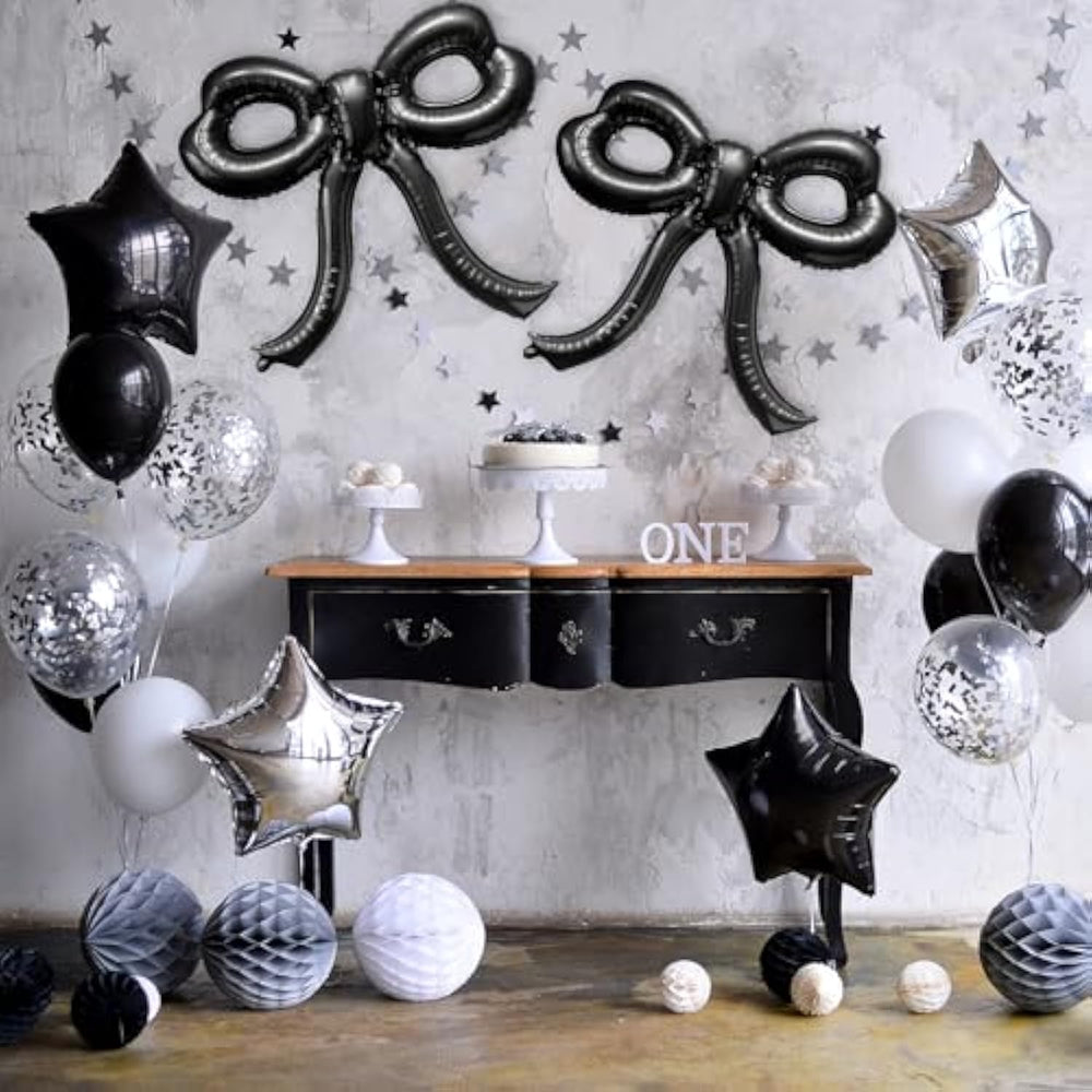 These vivid black bow foil balloons come in a set of 4, each measuring 30x28 inches, and include a white ribbon and a straw for easy inflation. The elegant black bows are large and eye-catching, making them the perfect addition to any celebration. Whether you're decorating with a black and white balloon arch kit, creating balloon garlands, or adorning tables and walls, these charming balloons will leave a lasting impression on your guests. They also make a great photo backdrop, adding a touch of sophistication to your pictures. Ideal for various occasions, these black bow balloons are perfect for girl and women birthday parties, weddings, bridal showers, baby showers, princess-themed events, gender reveals, and more.