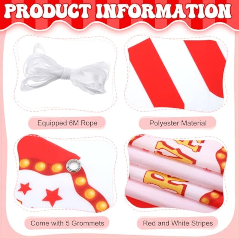 | Package Include: You Will Receive 4 Circus Tent Decorations And 1 String Of Rope In 6-Meter; The Size Of Each Carnival Banner Is 78.74 X 9.84 Inches, Suitable For Most Party Decor; Sufficient Quantity To Meet Your Circus Decoration Needs | | Carnival Signs: Our Carnival Decorations Adopt Classic Red And White Stripes Design, With The Word " Carnival" , And Matched With Stars And Lights Design, Making Your Carnival Party Decor More Exquisite And Unique, Attracting Everyone'S Attention | | Easy To Use: Each Carnival Awning Banner Features 5 Copper Grommets, Allowing You To Hang Them Easily Using The Rope We Provide; You Can Hang Them On Walls, Windows, Or Use Them To Decorate Your Popcorn Stand Or Game Booth, Adding A Cheerful Atmosphere | | Quality Material: Our Circus Awnings Are Made Of Quality Polyester, Lightweight And Durable, Not Easy To Break, And The Rope Is Strong, Which Can Hung The Tent Decoration Well And Not Easy To Blow Down; You Can Also Fold Them Up For Other Events | | Wide Application: Our Carnival Stripe Decorations Are Suitable For Circus Theme Parties, Carnival Parties, Concession Stand Decorations, Themed Birthday Parties, And Any Other Memorable Events | |