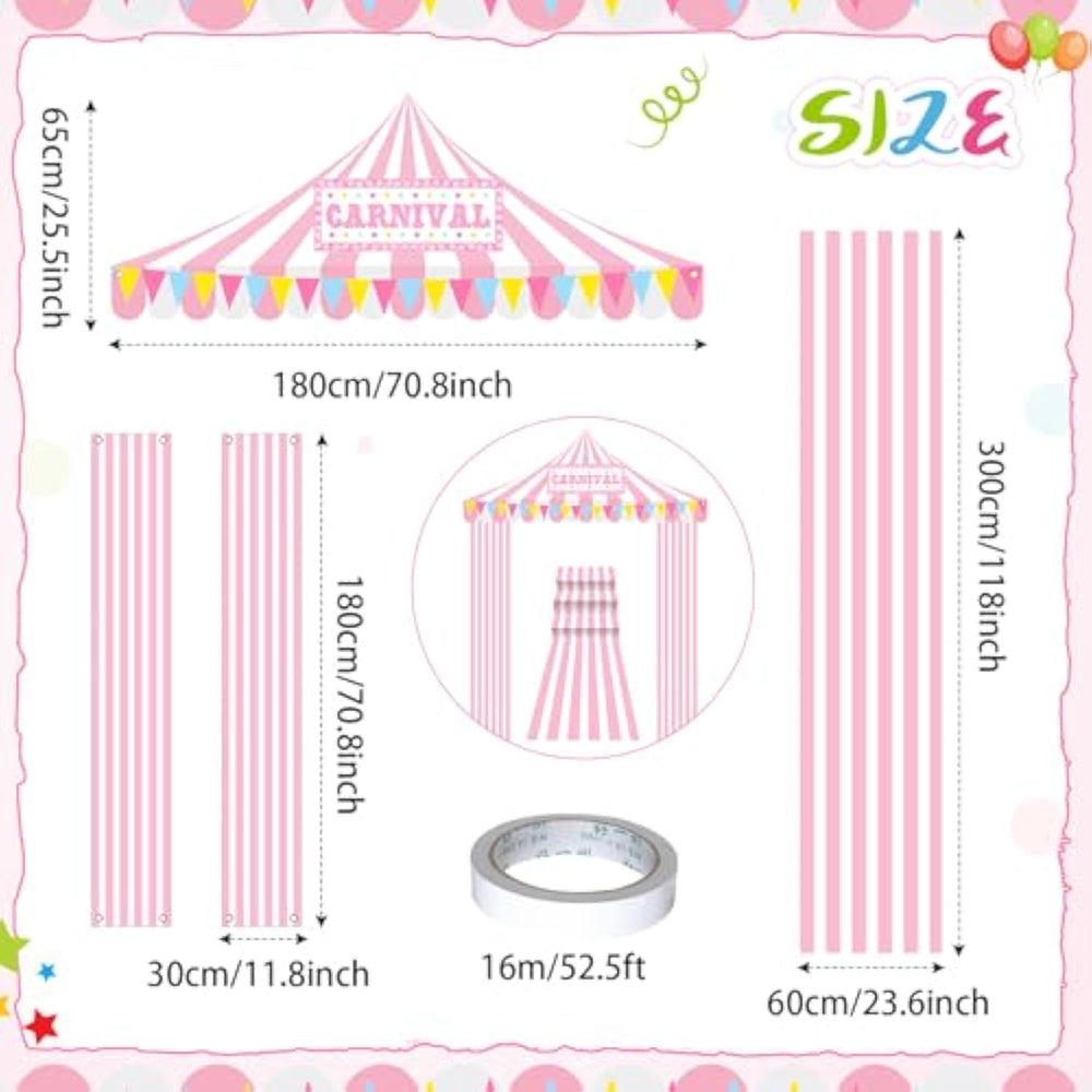 | Carnival Party Set: Carnival Entryway Decoration Kit Includes 1 Circus Awning Decoration With Circus Printed Sign Pattern, 2 Pink And White Striped Carnival Banners, 1 Carnival Floor Runners, 1 Roll Of Double Sided Tape For Easy Hanging And Sticking | | Reliable Quality: The Carnival Circus Decoration Kit Is Made Of Polyester, Which Is Soft And Reliable, Not Easy To Tear Or Break, And The Bright White And Pink Colors Are Not Easy To Fade, Giving You An Eye Catching Decorative Effect And Can Be Applied For A Long Time | | Easy To Install: The Circus Entrance Set Comes With Ribbon And Double-Sided Tape; You Can Hang It With The Ribbon, Or Stick It To The Wall With The Double-Sided Tape; Stick The Pink And White Striped Carpet To The Base Plate To Easily Create A Nice Circus Entrance Decoration (Polyester Cloth Should Be Ironed Before Use For Better Results | | Suitable Size: Carnival Circus Runway Carpet Is Approx. 24 Inches Wide And 118 Inches Long, Circus Tent Decorations Are Approx. 70.8 X 26 Inches, Pink And White Striped Carnival Banner Is Approx. 11.8 X 70.8 Inches, Enough Size Allows You To Apply It At Parties With Confidence, Let Your Party Attract Attention | | Various Occasions: The Carnival Entrance Decoration Kit Is Suitable For Circus Carnival Theme Event Parties, Circus Parties, Birthday Parties, Party Decorations, Etc. You Can Hang It With A Rope On The Front Door, Front Porch, Living Room, Courtyard Or Backyard, And It Can Also Be Applied As A Centerpiece For The Dining Table And A Photo Prop, Making Your Party More Memorable | |
