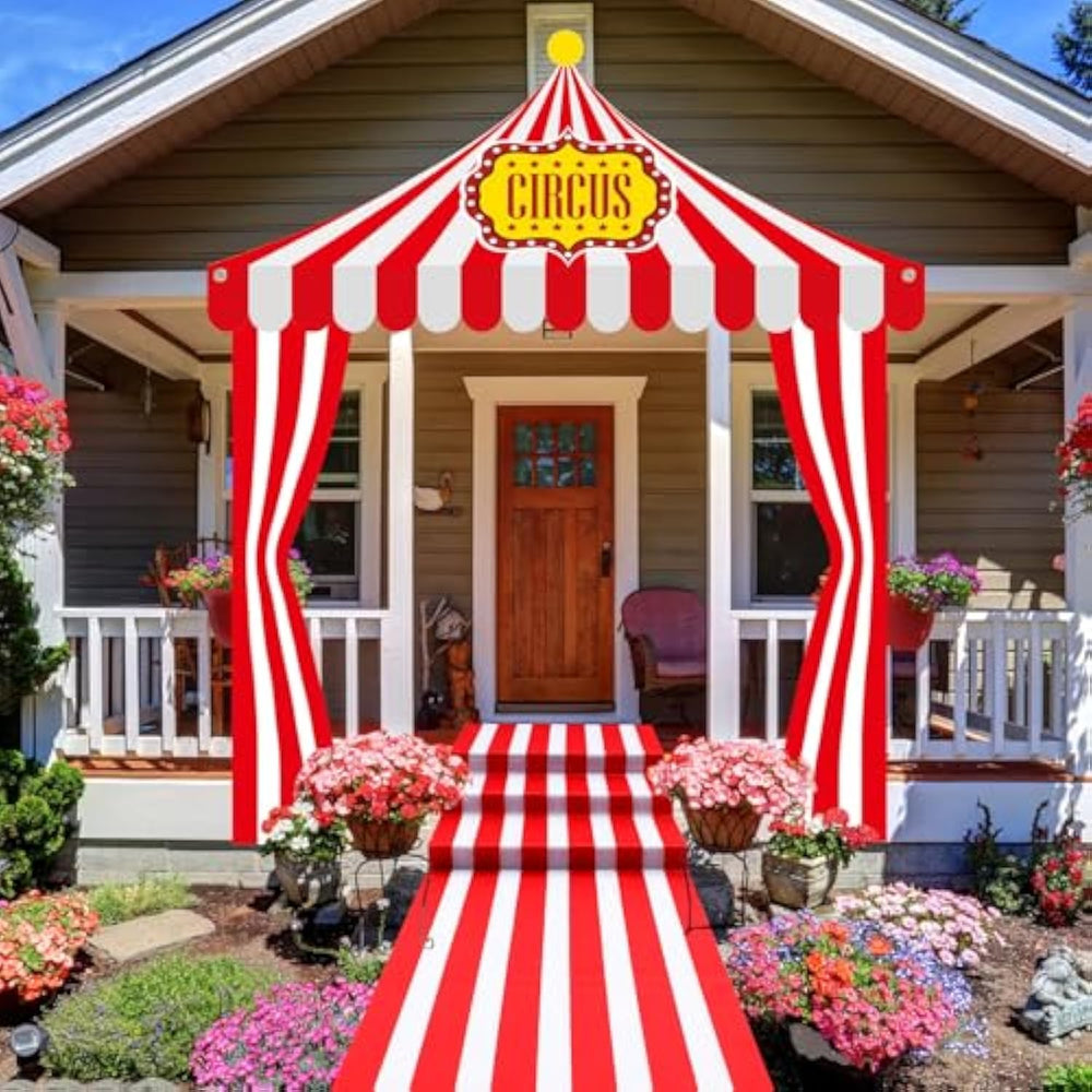 | Carnival Party Set: Carnival Entryway Decoration Kit Includes 1 Circus Awning Decoration With Circus Printed Sign Pattern, 2 Red And White Striped Carnival Banners, 1 Carnival Floor Runners, 1 Roll Of Double Sided Tape For Easy Hanging And Sticking | | Reliable Quality: The Carnival Circus Decoration Kit Is Made Of Polyester, Which Is Soft And Reliable, Not Easy To Tear Or Break, And The Bright White And Red Colors Are Not Easy To Fade, Giving You An Eye Catching Decorative Effect And Can Be Applied For A Long Time | | Easy To Install: The Circus Entrance Set Comes With Ribbon And Double-Sided Tape; You Can Hang It With The Ribbon, Or Stick It To The Wall With The Double-Sided Tape; Stick The Red And White Striped Carpet To The Base Plate To Easily Create A Nice Circus Entrance Decoration (Polyester Cloth Should Be Ironed Before Use For Better Results | | Suitable Size: Carnival Circus Runway Carpet Is Approx. 24 Inches Wide And 118 Inches Long, Circus Tent Decorations Are Approx. 70.8 X 26 Inches, Red And White Striped Carnival Banner Is Approx. 11.8 X 70.8 Inches, Enough Size Allows You To Apply It At Parties With Confidence, Let Your Party Attract Attention | | Various Occasions: The Carnival Entrance Decoration Kit Is Suitable For Circus Carnival Theme Event Parties, Circus Parties, Birthday Parties, Party Decorations, Etc. You Can Hang It With A Rope On The Front Door, Front Porch, Living Room, Courtyard Or Backyard, And It Can Also Be Applied As A Centerpiece For The Dining Table And A Photo Prop, Making Your Party More Memorable | |