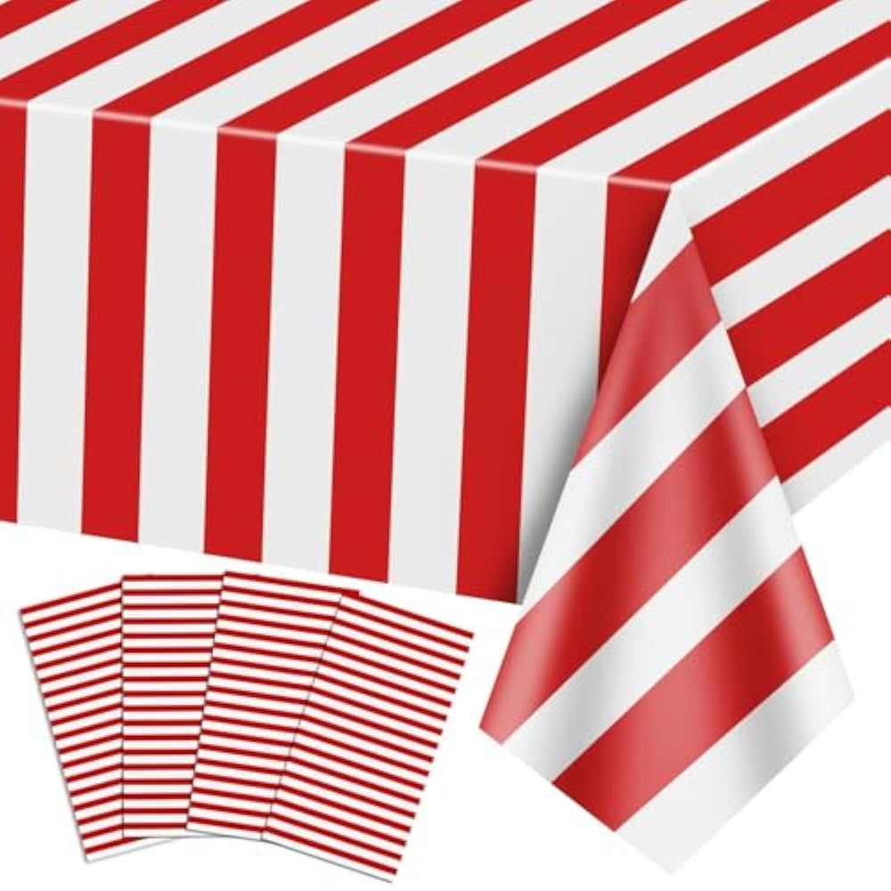 | Plastic | | Package Size: You Will Get 4 Pcs Carnival Theme Tablecloths, Measuring Approx. 51 X 86" / 130 X 220Cm, This Carnival Tablecloth Package Has A Sufficient Quantity To Meet Your Carnival Party Table Decoration Needs. | | Quality Material: This Red Tablecloth Is Made Of Quality Pe Plastic, Waterproof, Strong, And Durable, The Smooth Surface Makes It Very Easy To Wipe Clean. It Will Protect Your Table Well. | | Carnival-Themed Design: The Classic Red And White Stripe Combination Is Timeless And Fashionable, Making It The Perfect Addition To Your Carnival Party Theme, And Easy To Create A Happy Festival Atmosphere. | | Save Your Time: You Can Use A Wet Cloth Or Tissue To Remove The Dust Or Stains Remaining On The Red And White Tablecloth Easily During The Party Or Just Throw The Disposable Tablecloth Away After The Party, Which Saves You A Lot Of Time In Cleaning. | | Widely Use: These Carnival Decorations Are Popular For Kids, And Adults, With This Attractive Carnival Table Cover For Carnival Parties, Christmas Dinners, Festivals, Picnics, Wedding, Birthdays, Outdoor Activities, Daily Dinners, Gatherings Of Friends, Carnival Backdrop, Baby Shower Decorations, Indoor And Outdoor Events, Etc. | |