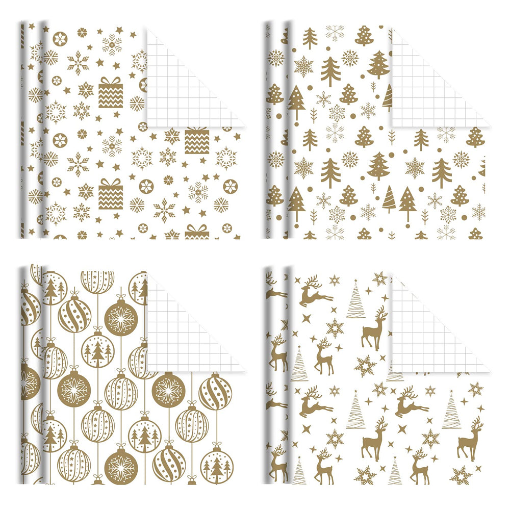 | Perfect Size: Each Roll Measures 30 Inches Wide And 12 Feet Long. The Total Area Of Each Roll Is 30 Square Feet, And The Total Area Of The Set Is 120 Square Feet. Gold Christmas Pattern: Bundle Of Gold Gift Wrap Features Variety Of Christmas Designs:Snowflakes With Various Shapes, Christmas Trees And Birch Trees With Various Styles, Standing And Running Elk, Exquisite Gift Box And Five-Pointed Star, Christmas Balls With Different Patterns.With A Smooth Glossy Finish, And A Metallic Foil Shine. Cut Lines Design: Each Roll Of Gift Wrap Features Grid Lines On The Reverse Side For Straight Cutting And Perfectly Wrapped Presents. Premium Quality: Our Wrapping Paper Are Made Of High-Quality Coated Paper,Thick And Not Easily Tear Or Rip.Item Came With Shrink Film To Prevent Wrapping Paper From Scratches And Reduce Dust. Dress Up Your Gifts: The Christmas Wrapping Paper Set Has An Exquisite And Artistic Design And Can Be Used To Decorate Gift Boxes, Books,Wine Bottle,Chocolates,Gift Cards And Other Christmas Gifts.With The Decoration Of The Gift-Wrapping Paper Set, The Gift You Prepare Is Particularly Attractive And Will Inspire Family And Friends To Open It.