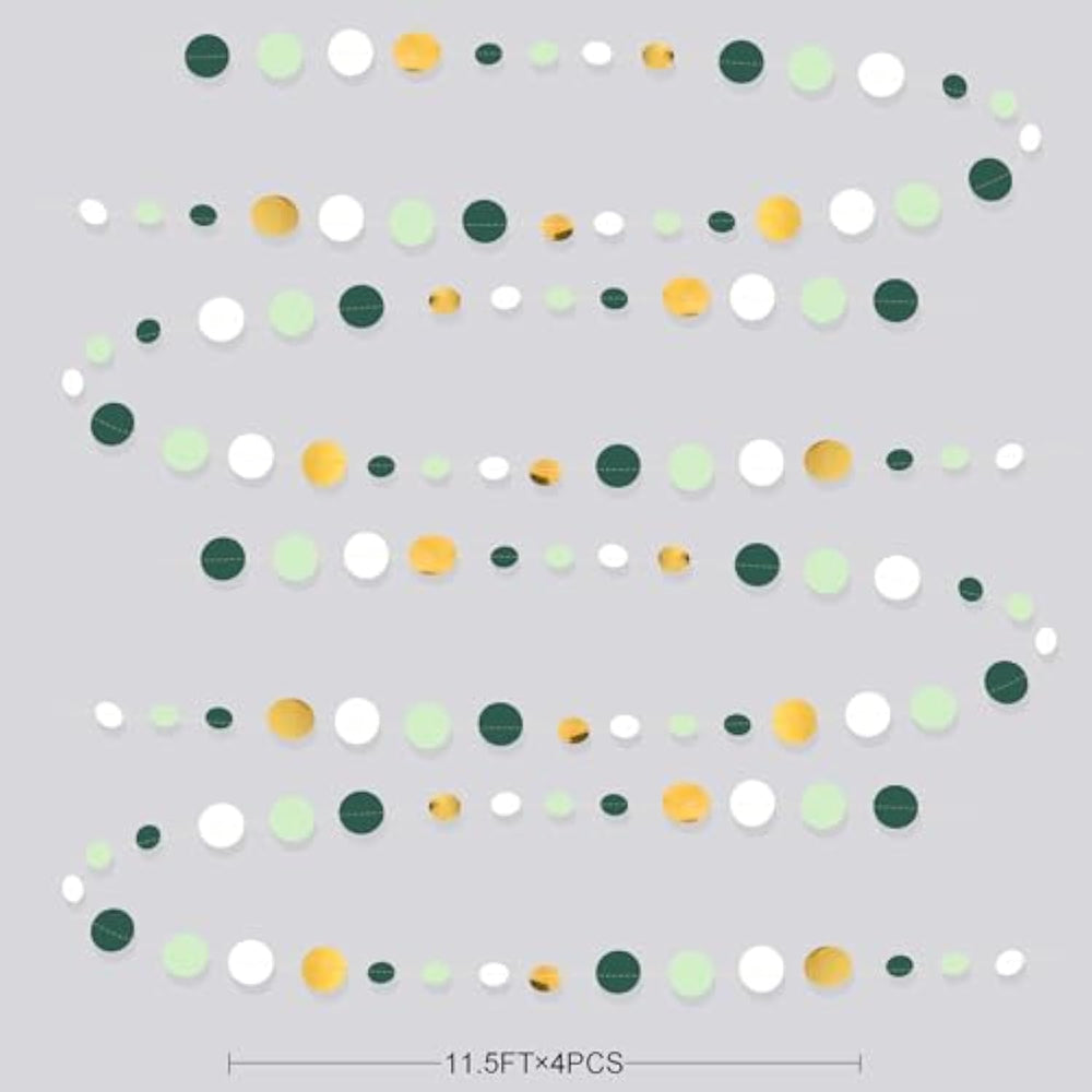 This set includes 4 strings of sage green, white, and gold circle dot garland banners, each measuring 11.5 feet for a total of 46 feet, providing ample length for decorating. Made from high-quality double-sided cardstock and sewn together by machine, these garlands are durable, eco-friendly, and reusable. The combination of various colors like hunter green, sage green, metallic gold, white, and beige in mixed sizes creates a charming and elegant backdrop that enhances photos and adds a magical atmosphere. Perfect for jungle, safari, woodland, or sage green themed events, they are suitable for birthdays, baby showers, weddings, bridal showers, engagements, or even classroom displays.