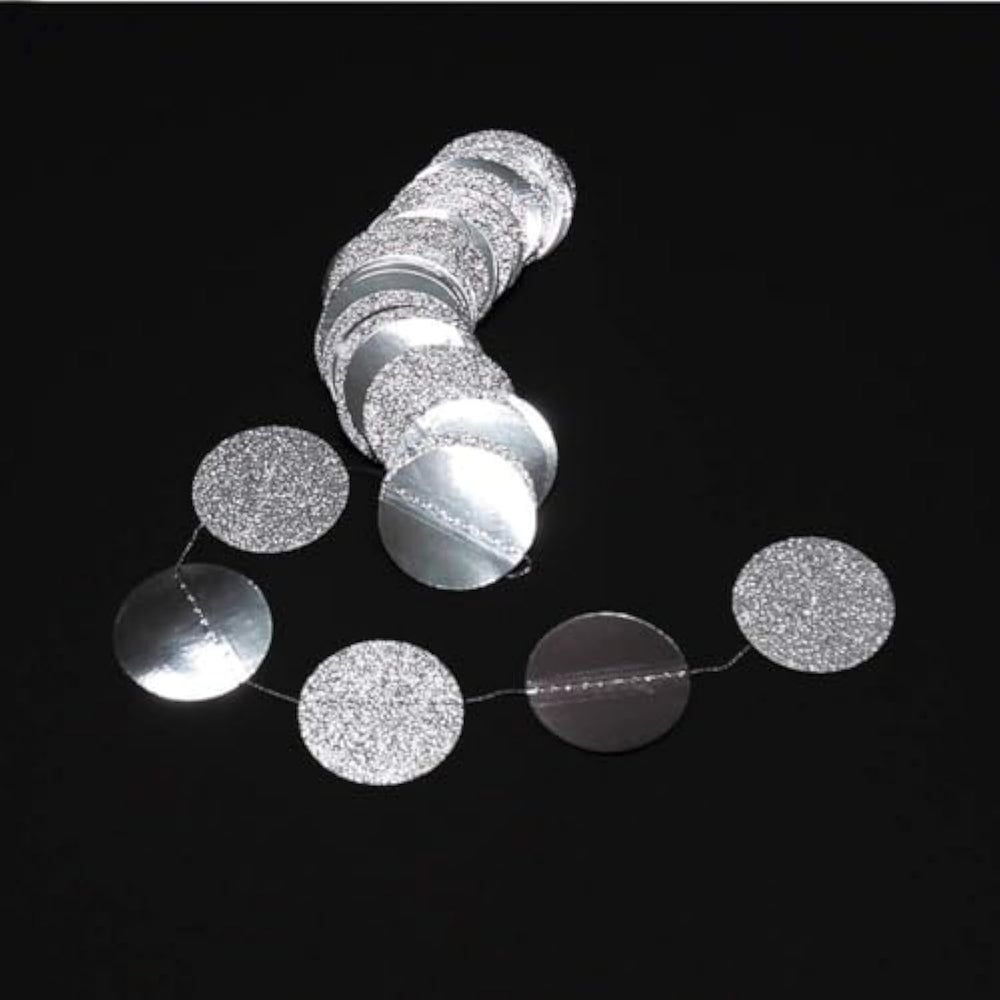 This set includes four strands of silver circle garlands, each measuring 13 feet long for a total of 52 feet. Made from high quality glitter cardstock and sewn with durable silver thread, these garlands add a touch of sparkle to any event. Their reflective design makes them ideal for disco parties, winter wonderland themes, Hollywood glam nights, or celestial celebrations. Versatile and stylish, they can be hung on walls, ceilings, windows, doorways, or behind tables to create a magical backdrop. Easy to hang and reusable, these garlands are a simple yet impactful way to elevate the atmosphere of weddings, baby showers, birthdays, and more.