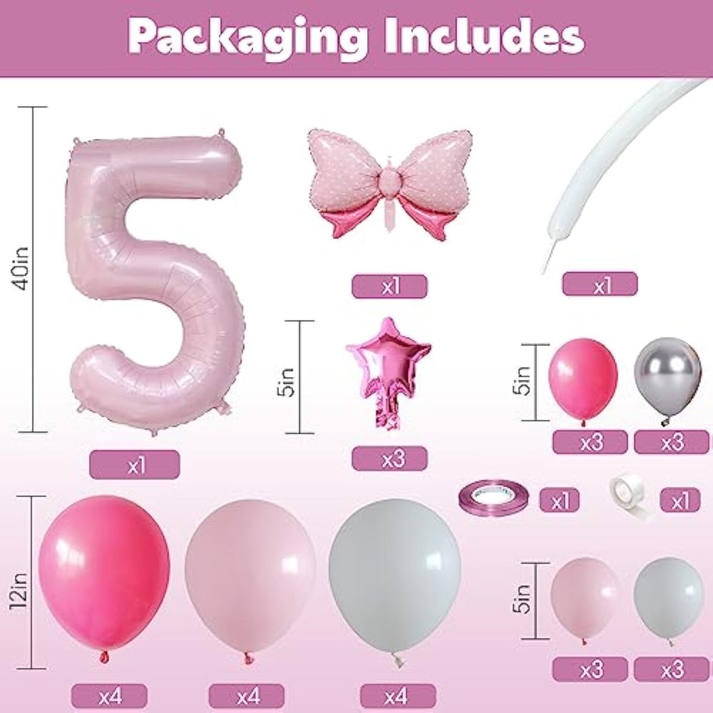 | Package Includes - Pastel Pink Number 5 Balloon Tower Set Includes 1 Pc 40 Inch Pink Number 5 Foil Balloon, 3 Pcs 5 Inch Pink Star Foil Balloons, 1 Pc Mini Pink Bow Foil Balloons, 12Pcs 12 Inch Balloons (4 Pcs Rose Red, 4 Pcs Macaron Pink, 4 Pcs White), 12 Pcs 5 Inch Balloons (3 Pcs Metallic Silver, 3 Pcs Rose Red, 3 Pcs Macaron Pink, 3 Pcs White), 1 Pc White Long Balloon, 1 Pc Glue (100 Dots), 1 Pc Ribbon (10M). | | Premium Materials - The Number Foil Balloon, Bow Foil Balloon, Stars Foil Balloons In The Pink Number Stack Set Are Made Of High-Quality Aluminum Foil Film Material And Adopt Self-Sealing Design; Other Balloons Are Made Of Upgraded Latex, That Are Much Thicker Than Others, Non-Toxic, Tasteless, Safe, Reusable, Easy To Inflate. You Can Use Our Premium Balloons Set With Confidence. | | Flexible Diy - In Addition To A Number Balloon, This Number Birthday Balloons Decoration Set Also Has Latex Balloons And Star Foil Balloons. You Can Form Them Into A Beautiful Number Balloon Tower According To The Diy Manual, Or Paste Them To The Wall Or Fill Them With Helium To Float In The Air To Enhance The Party Atmosphere. (Tips: 5 Inch Balloon Can'T Float.) The Package Includes Long Balloons And Glue Dots. You Can Quickly Assemble Into A Beautiful Balloon Tower As You Like. | | Suitable For Multiple Scenarios - Each Number Foil Balloon Is Independent, Such As 1 And 8, Which Can Be Used As 1 Or 8 Or 18 Or 81. There Are Numbers Balloons From 1-9 To Choose From. You Can Choose Two Sets To Form The Number You Want. Digital Balloon Tower Is Suitable For Birthday, Baby Shower, Wedding, Valentine'S Day, Celebration, Anniversary, New Year, Carnival, Festival, Photography Props Or Other Occasions. The Personalized Balloon Set Will Bring You Surprises And Unforgettable Parties. | | Attention - Due To The Light And Screen Difference, The Color Of The Balloon May Be Slightly Different From The Picture. Due To The Thermal Expansion And Contraction Characteristics Of Aluminum Foil Balloons, Please Avoid Filling More Than 90% Of Air Or Helium. If The Ambient Temperature Is Too Low, It Will Also Cause The Balloon To Deflate. At This Point, You Can Inflate It Again. Please Keep The Balloon Away From High Temperature And Sharp Objects To Avoid Puncturing The Balloon. | |