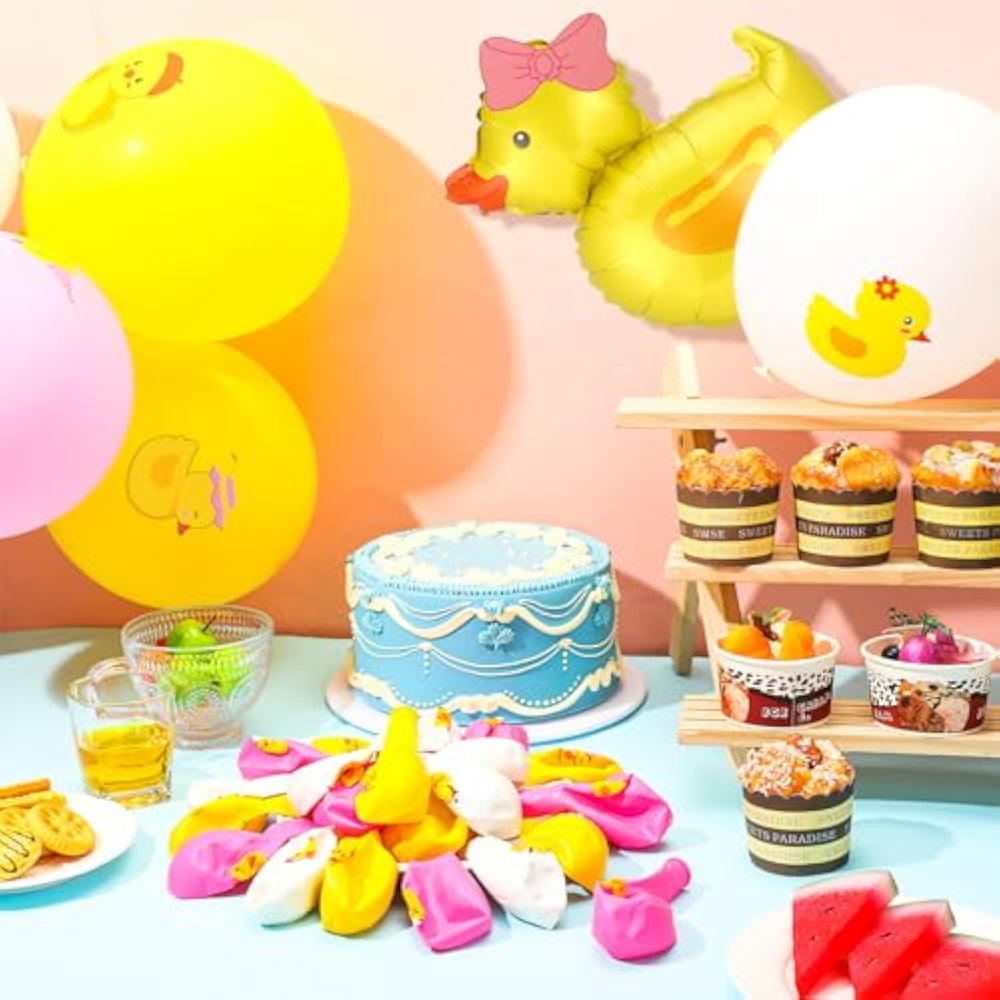 | Birthday Party Decoration: Package Includes 36 Pieces Of 12 Inch Duck Latex Balloons, With 9 Different Patterns And 3 Background Colors, Pink, Yellow And White, Comes With 4 Pieces Of Duck Foil Balloons And 4 Bow Knots; Enough Quantity To Meet Your Parties Decorative Demands | | Easy To Decorate: You Can Decorate These Duck Balloons On Walls, Doors, Windows, Ceilings, Corridors, Trees, Backdrops And More, Adding Festive Atmosphere And Making Your Parties Unforgettable | | Adorable Designs: The Duck Birthday Party Balloons Are Designed With Various Cute Ducks With Different Images, Like Holding Umbrella, Wearing Birthday Hat, Holding Gift Box And More, Eye Catching And Interesting, Most People Will Loved Them | | Proper Size And Material: These 12 Inch Duck Birthday Decorations Balloons Adopt Latex Material, Safe And Reliable, And The Duck Shaped Balloons Are Made Of Aluminum Foil, Not Easy To Break Or Leak, Will Serve You For A Whole Party | | Delicate Party Additions: The Balloon Arches Garland Kit Is Ideal For Decorating Birthday Party, Baby Shower, Gender Reveal, Animal Themed Party, Graduation And So On, Nicely Delight Your Parties | |