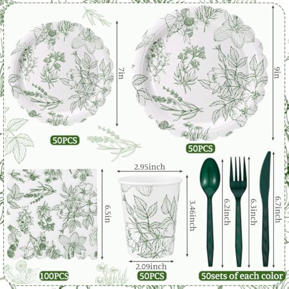 | Adequate Quantity For Various Events: This Sage Green Disposable Tableware Set Comprises 100 Plates, 100 Napkins, 50 Forks, 50 Spoons, 50 Knives, And 50 Cups, Enough To Cater To Large Parties And Gatherings | | Safe And Sturdy: The Plates And Napkins Are Made Of Tough Paper That Doesn'T Break Easily Ensuring A Hassle Free Dining Experience; The Spoons, Forks, And Knives Are Made Of Plastic, They Will Survive The Length Of Your Party Without Giving Way | | Ideal Size: The Sage Green Paper Plates Come In Two Sizes, 9 Inches And 7 Inches, Ideal For Full Meals Or Bite Sized Appetizers And Desserts; The Napkins Are 13 X 13 Inches, Can Easily Handle Any Spills Or Accidents At Your Party Or Gathering, Ensuring A Clean Experience For Your Guests | | Elegant And Fresh Color: Imbreathe Life Into Your Event With The Calm And Refreshing Sage Green Shade Of This Tableware Set; As A Greenery Floral Tableware Set, It Adds A Dash Of Elegance And Sophistication, Enhancing The Aesthetic Appeal Of Your Food, Dessert Table, Or Party Theme | | Versatile For A Range Of Occasions: This Greenery Floral Cutlery Set Is Not Just For Parties And Large Gatherings; It Works Good For Everyday Use, Outdoor Picnics, Camping, Barbecues And More; The Striking Sage Green Color Is Visually Attractive And Goes With All Types Of Decoration, Making It The Nice Choice For Various Scenarios | |