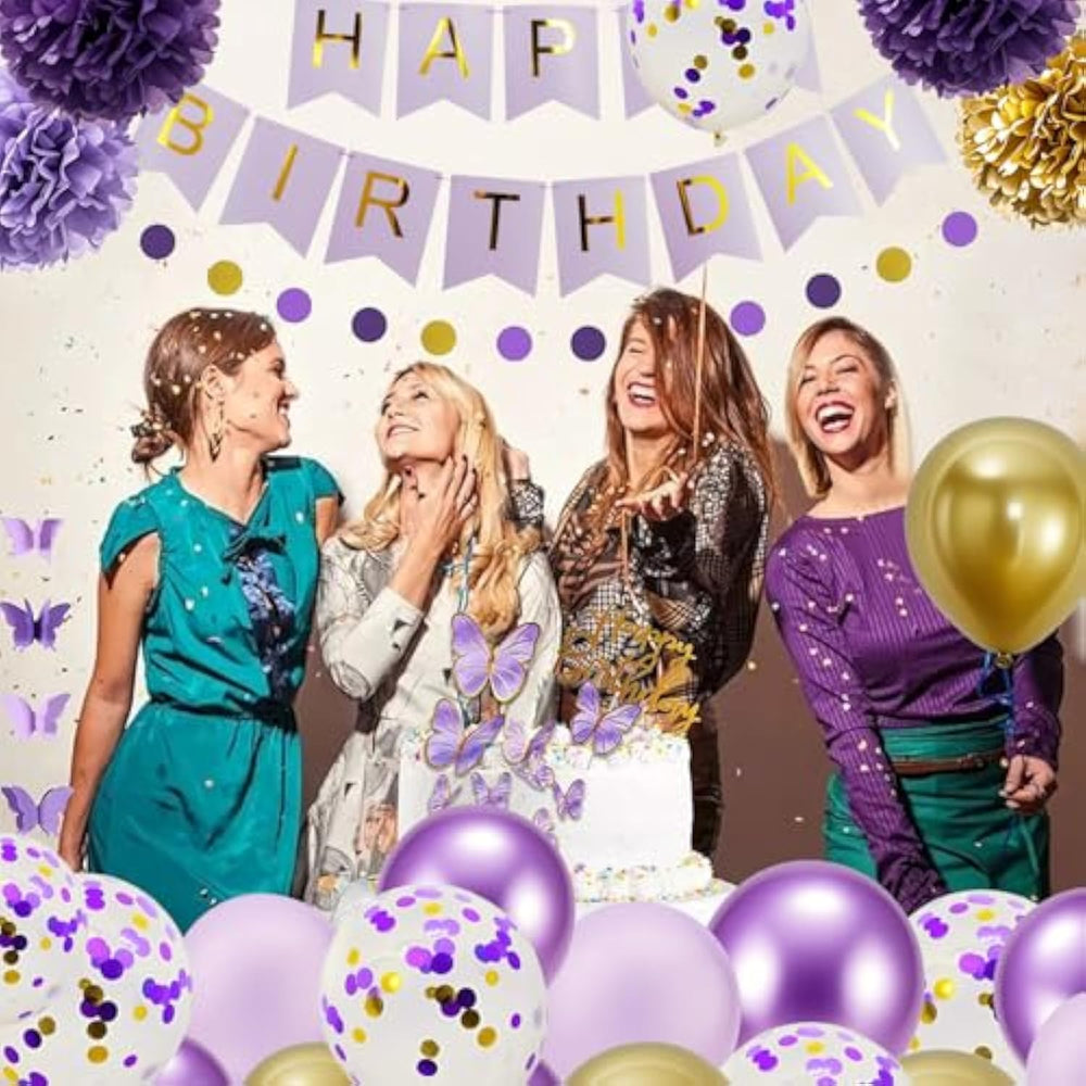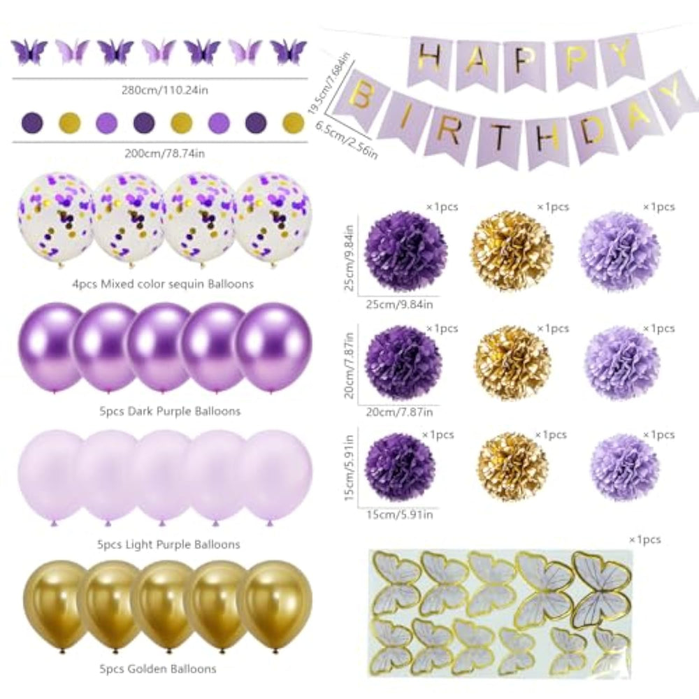 | ?Large Packs?-This Luxury Value Pack Includes 40 Pieces, Suitable For Various Occasions Such As Birthday Party Decorations | | ?Details Component?: 15 10-Inch Latex Balloons In 3 Colors: 5 Dark Metallic Purple, 5 Light Metallic Purple, 5 Metallic Gold 4 12-Inch Latex Confetti Balloons 3 10-Inch/25Cm Paper Pom-Poms: 1 Dark Purple, 1 Light Purple, 1 Gold 3 7.87-Inch/20Cm Paper Pom-Poms: 1 Dark Purple, 1 Light Purple, 1 Gold 3 5.9-Inch/15Cm Paper Pom-Poms: 1 Dark Purple, 1 Light Purple, 1 Gold 1 6.56Ft Purple Gold Paper Dots Hanging Garland 1 9.19Ft Purple Paper Butterfly Hanging Garland 1 Gold Happy Birthday Cake Copper 6 Butterfly Cake Coppers 1 Happy Birthday Banner 1 5M Balloon Chain 1 10M Purple Ribbon | | ?Easy Assembly?-Unfold Each Paper Pompom, Firmly Tie The Ribbon In The Middle, And Then Adjust It Layer By Layer.They Look Great, But Assembling Them Takes A Little Patience. | | ?Safe Materials?These Birthday Party Balloons Are Made Of Top - Grade Latex. They’Re Non-Toxic, Odorless, And Suitable For Filling With Both Helium And Air.They Inflate Easily And Are Durable Enough For Kids To Play With Safely. | | ?Perfect Decoration?– Liven Up Your Parties! They’Re Ideal For Birthday Events Of All Ages,Such As Teenage Birthday Party,Adult Birthday Party,Women'S 30Th Birthday Party,Girl'S Sweet 16 Party. They Work Well Indoors Or Outdoors, Provided The Weather Is Dry. | | ?Expedite Planning?Get All Party Decorations From This Curated Package, Saving Time On Shopping.It’S Ideal For Birthday Parties, Baby Showers, And Events For Men, Women, Boys, Or Girls.It’S Also A Good Choice As Gifts For Family Or Friends. | | ?
