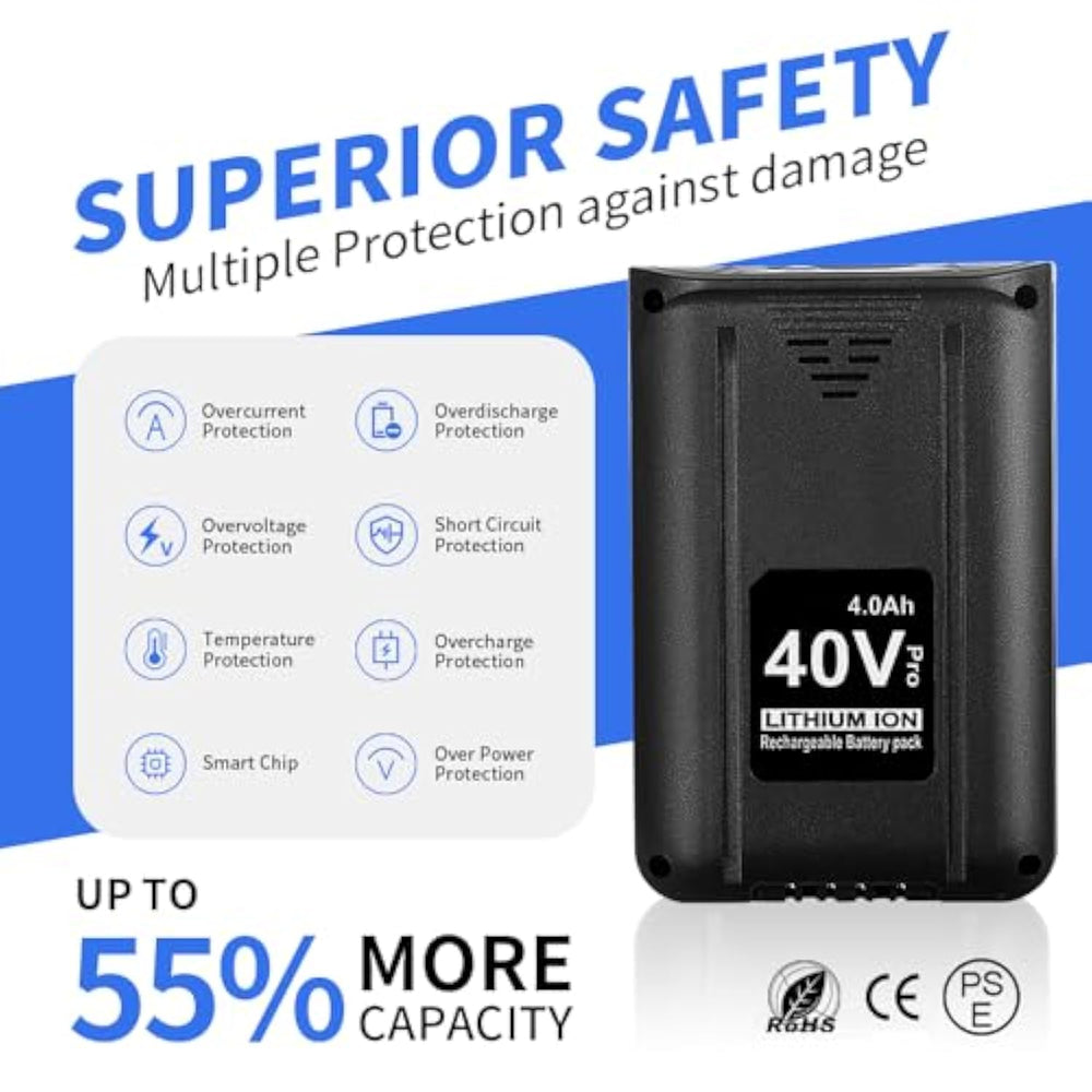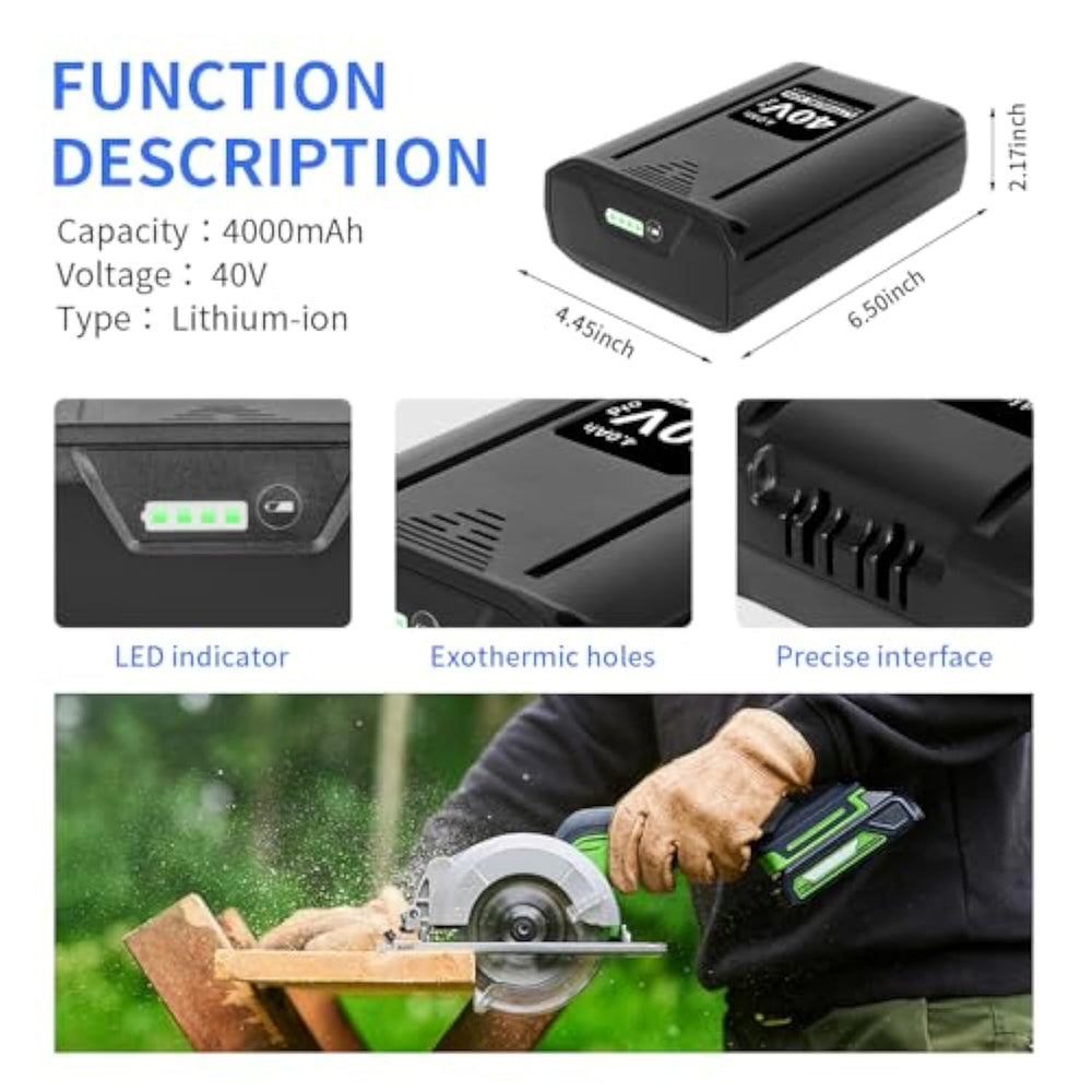 ?? ?Battery Specifications? A Replacement Battery For Kobalt 40V, Type: Lithium-Ion | Voltage: 40V | Capacity: 4000Mah | Our Replacement Battery Closely Matches The Original In Fit, Capacity, Charging Speed, And Overall Compatibility. | | ?? ?Perfect Compatible? Our Battery Seamlessly Replaces Kobalt 40V Models Including Kobalt Kb640-03 Kb540C-06 Kb245-06 Kb240-06 Kb540-06 Etc.It'S 100% Compatible With Original Kobalt 40V Tools And Fast Charge With Original Kobalt 40V Battery Charger Krc60-06, Krc40-06 ,Krc 840-03. | | ?? ?Overcharge And Overdischarge Protection? Built-In Ecp Smart Protection Chip Provides Overcharge And Overdischarge Protection To Extend Battery Life. | | ?? ?Convenient Battery Status Indicator? Equipped With Led Lights, Our Kobalt Replacement Battery Allows For Easy Monitoring Of Remaining Power. Stay Informed About Battery Levels At A Glance, Enabling Better Work Organization And Planning. | | ?? ?Certified Quality Assurance? Our Replacement Battery Bears The.