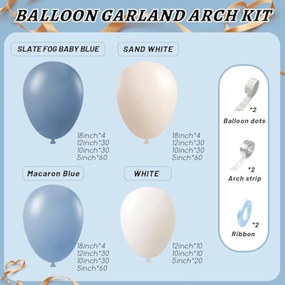 | Package List : Blue And White Balloon Arch Kit 412Pcs , Slate Fog Baby Blue Balloons (4 X 18In, 30 X 12In, 30 X 10In, 60 X 5 In),Macaron Blue Balloons (4 X 18In, 30 X 12In, 30 X 10In, 60 X 5 In), Sand White Balloons (4 X 18In, 30 X 12In, 30 X 10In, 60 X 5 In), White Balloons( 10 X 12In, 10 X 10In, 20 X 5 In) Glue Dotsx200, Ribbonx2, Decorative Stripx2. Plenty In Quantity, Perfect For Creating Stunning Indoor Or Outdoor Balloon Garlands And Arche | | Easy To Use: You Can Simply Inflate The Balloon And Then Assemble The Balloon Arch In The Style You Wants, Easy To Use And Decorate.Dusty Blue Balloon Arch Kit,Decorate Your Home Beautifully Bring A Party Vibe, And Suit Any Occasion. | | Premium Material: Blue And White Balloon Arch Kit Made Of Latex Material,Durable And Not Easy To Burst, A Variety Of Colors And Sizes For You To Choose, Bulk Balloons Are Packaged By Size Separately, Saving Your Time.Meet Your Different Uses,Blue Balloon Garland Making Your Balloon Decoration More Luxurious. | | Applicable Occasions: Blue Balloon Arch Is Graduation, Baby Shower,Christmas, Halloween, Graduations, Festivals, Engagements, Anniversaries, Etc, It Is A Perfect Decoration For Any Occasion. Bluey Balloon Arch Can Leave Good Memories With Your Family And Friends | | Cautions And Warnings:Avoid Overfilling Balloons And Keep Them Away From Direct Sunlight, Sharp Objects, And Excessive Friction. Note: Balloon Colors May Vary Slightly Before And After Inflation. For A Darker Shade, Layer Two Balloons Together. | |
