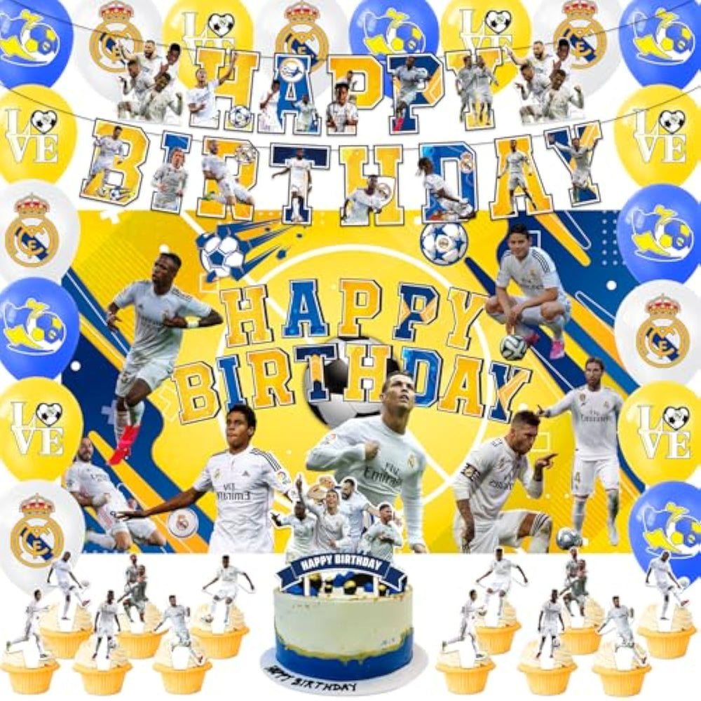 | The Madrid Birthday Party Supplies Pack Set Coming Include Cute Banner 1Pcs,High Quality 24Pcs Cupcake Stick,,1 Cake Topper,1 Blackdrop,15 Balloons | | About The :The Size Of The Is 12Inches Made By Nature Latex Print With Cute Charact,The Best Madrid Birthday Party Decoration | | Includes 13 Happy Birthday Letters. The Birthday Banner Is Made Of High Quality Paper, Non-Toxic And Tasteless, Environmentally Friendly, Lightweight And Reusable.7 Multi Color Different Type Each 2Pcs.Total 12 Pcs | | If You Have Any Questions, Please