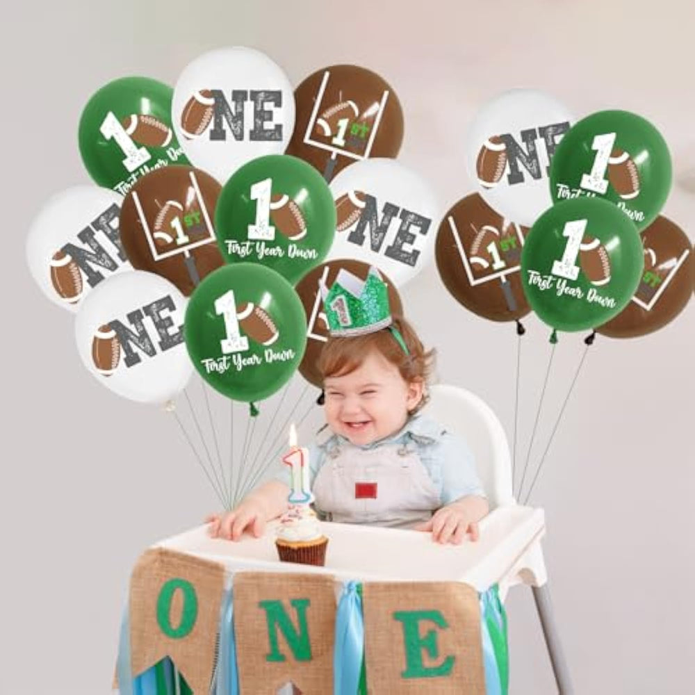 | ?Football Theme?Our Football First Year Down Balloons Combine Football With Goal Of The Field And Letters “First Year Down” “One”. Fantastic Design Creates A Strong Match Atmosphere For First Year Down Football Birthday Party. | | ?Football Balloons?Includes 45Pcs Football Balloons Latex (10") With 3 Patterns (15Pcs For Each Pattern) In 3 Colors: Brown, Green And White. You Can Diy These Balloons With Infinite Imagination And Creativity! | | ?High Quality?1St Birthday Football Balloons Are Made Of Premium Thick Latex, That Is Non-Toxic And Sturdy, And Makes It Less Likely To Pop. Features Vivid Pattern That Is Printed Clearly. | | ?Great Design?Perfect For Your Baby’S First Birthday Party With 1St Year Down Balloons. They Match Well With Other 1St Year Down Birthday Decorations: Football One Boxes, Football Balloon Arch, Backdrop, Banner, Tablecloth, Plates, Napkins And So On. Football First Birthday Decorations Are Perfect Photo Booth Props To Take Pictures For Your Baby, Which Will Leave Precious Memories. | | ?Easy To Use?Football Balloons For Party Can Be Easily Blown Up By Air Or Helium. If They Are Tied Tightly, Which Can Be Kept For Longer Fun. | |
