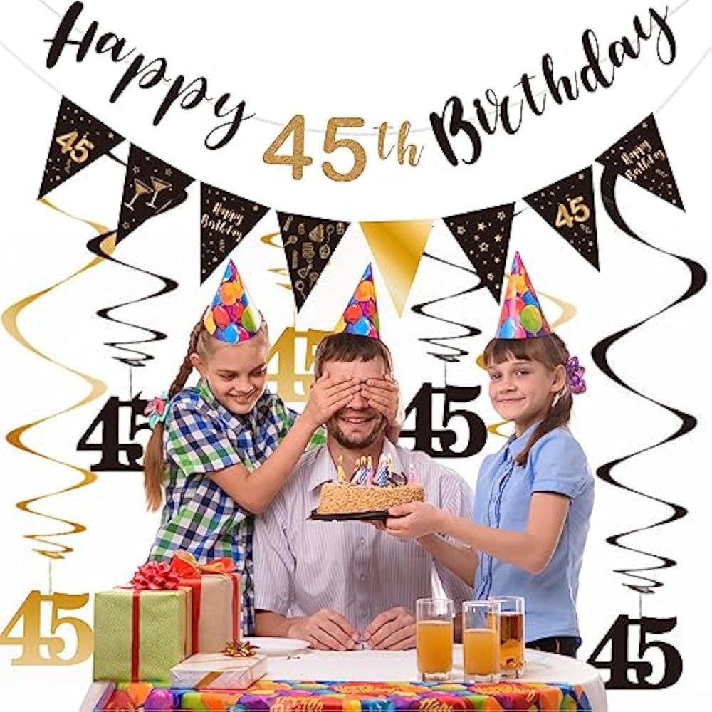 | The Package Includes: Happy 45Th Birthday Banner(1 Set), Triangle Banner(1 Set), Hanging Swirls(6 Pcs). | | Quality And Specification: The Happy Birthday Banner And Triangle Banner Are Made From Sturdy High Quality Eco-Friendly Cardstock. | | Wide Application: Hang Them From The Ceiling, Above A Table, Under The Veranda, Or From Branches In Trees. Use Them To Create A Dreamy Background For Your Birthday Party. | | Hanging Swirls: Made From Shiny Foil Material. Every Swirl With A Plastic Loop At The Top For Easy Hanging. Fun Decoration For Your 45Th Birthday Party. | | Product And
