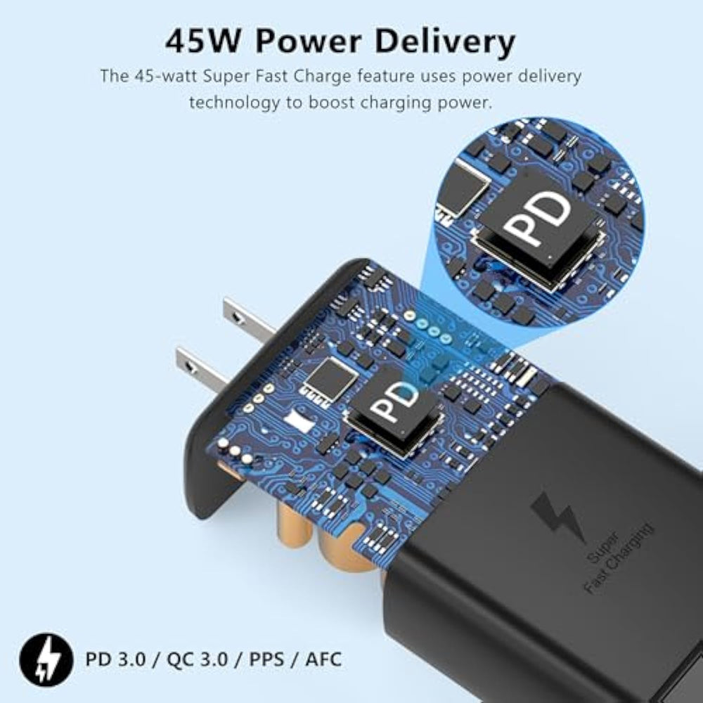 ??45W Samsung Charger?Input:100-240V 50-60Hz 1.2A; Output: (Pdo)5.0V=3.0A Or 9.0V=3.0A Or 12.0V=3.0A Or 15V=3.0A Or 20.V=2.25A ,(Pps) 3.3-11.0V=3.0A Or 3.3-16.0V=3.0A Super Fast Charging 2.0 45W | | ??Samsung Super Fast Charger?45W Super Fast Charging Type C Charger Fast Charging Compatible With Samsung Galaxy Galaxy S24/S24 Ultra/S24+/S23/S23 Ultra/ S23+/S22/S22 Ultra/S22+/S20 Ultra/Z Fold 4/Z Fold 5/Z Flip 4/Z Flip 5/Galaxy Tab S8 S7 /Tab S8 S7 Plus/Tab S8 Ultra/Samsung Galaxy Book3 Ultra/Galaxy Book3 Pro/Galaxy Book3 Pro 360/Galaxy Book3 360/Galaxy Book3/Galaxy Book2 Pro/Galaxy Book2 And 25W Super Fast Charging For Galaxy S21 Ultra/S21 Plus/S21/Note 20 Ultra/Note 20/Note 20 Plus/S20 Plus/S20 And More | | ??Super Fast Charger Type C 45W Samsung? The Super Fast Charger Cable Delivers Up To 5A To Give Your Phone Power At A Faster Rate Than Standard 1A Or 700Ma.Is Perfect For Home Use, Office, Travel, School Or Business. With Lightweight And Portable Design, You Also Can Carry This C.