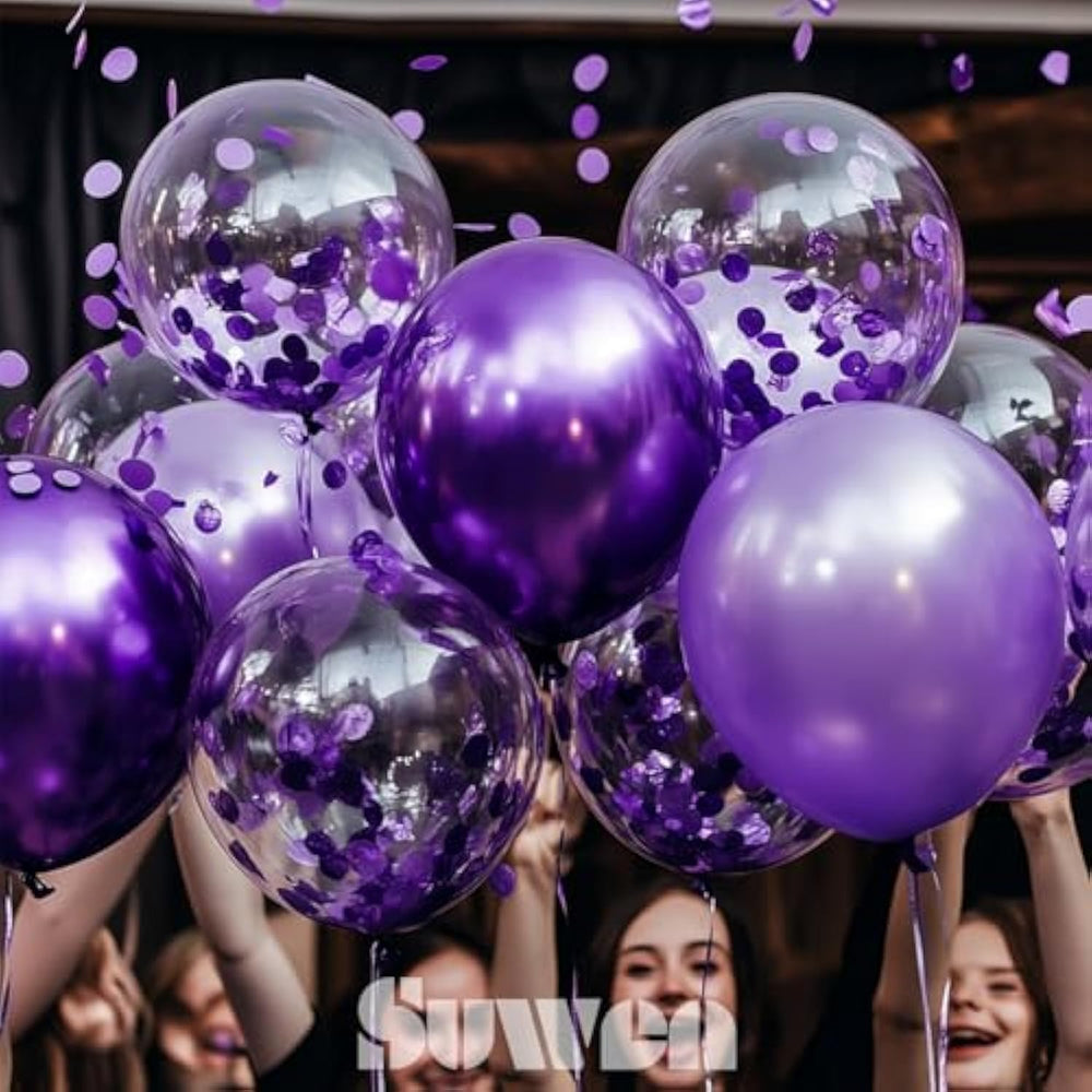 This 47-piece Purple Confetti Balloon Set is perfect for creating elegant and festive decorations for a variety of occasions. The set includes 30 metallic purple 10-inch balloons, 15 purple confetti 12-inch balloons, a garland strip, dot glue, and a silver ribbon, giving you enough to create a small balloon garland—though combining two or more sets is recommended for a larger display. Ideal for birthdays, graduations, baby showers, weddings, anniversaries, engagements, and other themed parties, these balloons also serve as stunning photo props when arranged over walls, trees, doorways, or tables. Made from high-quality natural latex from rubber trees, the balloons are eco-friendly, biodegradable, thick, stretchy, and durable with a shiny metallic finish. For best results, inflate balloons slowly to 90% capacity to prevent bursting and store in a cool place to maintain their vibrant luster.