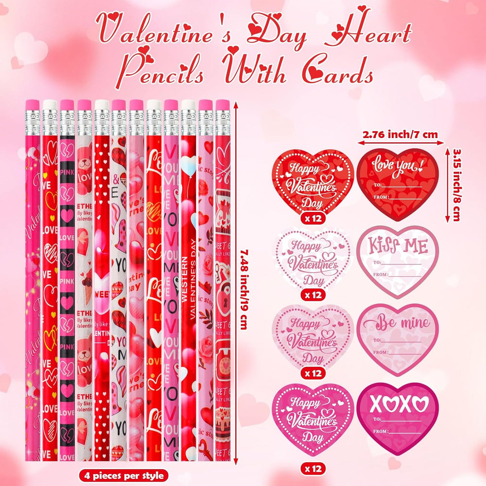 | Value Package: Our Valentine'S Day Gift Set Includes 48 Heart Themed Pencils With 12 Different Designs And 48 Sports Style Valentine'S Day Cards With 4 Designs; The Styles And Quantities Are Sufficient To Meet Your Daily Needs, Making It Good For Cooperation As Heart Themed Party Fillers And Valentine'S Day Exchange Gifts | | Suitable Size: Each Pencil Is Approximately 7.48 Inches/ 19 Cm Long, And The Card Size Is Approximately 2.76 X 3.15 Inches/7 X 8 Cm; You Can Place These Valentine'S Day Heart Pencils Into Our Valentine'S Day Card Batch Cutouts As Gifts For Others; The Back Is Also Designed With "Recipient" And "Sender", With The Recipient'S Name And Your Sincere Wishes Written On It, And Then Send It To Your Family And Friends To Express Your Love | | Reliable Materials: The Cute Pencil Is Made Of Graphite, Which Writes Smoothly, Is Durable And Not Easily Broken; Each Pencil Has An Eraser At The Top For Easy Erasing; The Card Is Made Of Cardboard, With Clear Patterns And Exquisite Craftsmanship, Making It An Effective Way To Express Love On Valentine'S Day | | Heart Themed Valentine'S Day Design: Valentine'S Day Cards And Pencils Are Carefully Designed Around 4 Heart Themes, With Each Card Featuring A Different Heart And Classic Colors, Including Pink, Rose Red, Purple, And Red, Making The Cards More Attractive; The Cards Are Printed With Bright Colors, Creating An Atmosphere And Attracting Attention | | Ideal Valentine'S Day Party Gift: Our Valentine'S Day Sports Gifts Can Be Applied In Many Places, Such As Valentine'S Day, Holidays, Christmas, Birthdays, Homes, Offices, Etc.; They Can Be Applied As Party Gifts, Rewards, Etc | |
