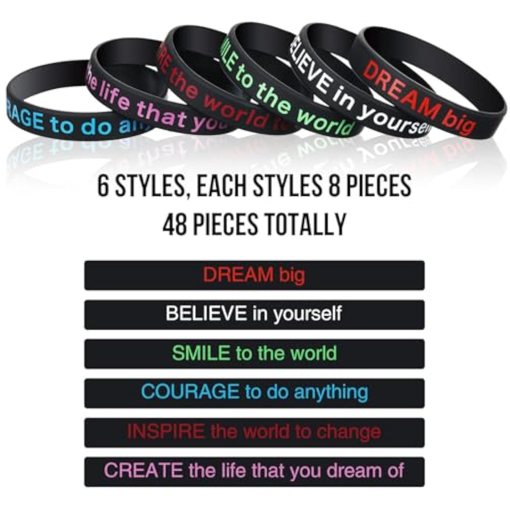 | Novel Design: The Silicone Bracelets Are Printed With Colorful Motivational Words Or Short Sentences, Which Are Simple And Beautiful, Positive Messages Give People Encouragement And Warmth, And Celebrate Black History Month In February With These Bracelets. | | Material: The Inspirational Wristbands Are Made Of Silicone, Nice Material That Is Soft And Suitable For Your Long-Time Use, Stretch And Comfortable, Bring You Nice Wearing Experience | | Proper Size: The Motivational Rubber Bracelet Is Approx. 6 Cm/ 2.3 Inches In Diameter, 1.3 Cm/ 0.5 Inches In Width And 20 Cm/ 8 Inches In Circumference, Proper Size With A Certain Stretch, Suitable For Most People | | Wide Use: The Silicone Wristbands Are Nice Decorations For Your Daily Wearing, Showing Your Attitudes, Nice Gifts For Families Or Friends On Birthday, Christmas, New Year'S Day, Bring Them Positive Energy, Good As Classroom Prizes For A Black History Month Quiz Or As Giveaways At A Black History Month Community Event | | Quantity: You Will Get 48 Pieces Of Silicone Bracelets In 6 Different Styles, 8 Pieces Each Style, Enough Quantity For Your Daily Use And Change And You Can Also Share With Your Partners | |