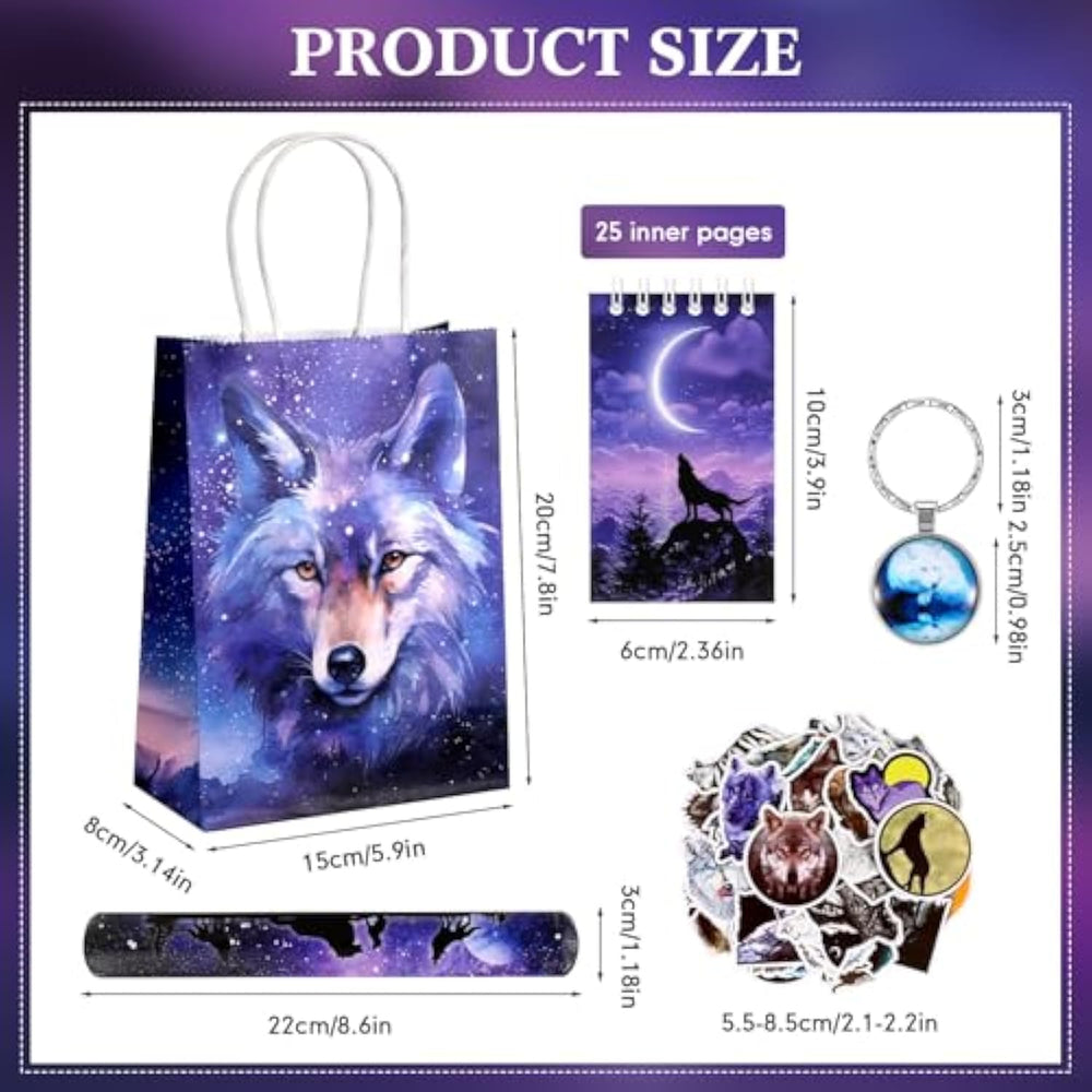 | Wolf Birthday Party Supplies: Package Includes 12 Wolf Paper Bags With Handles, 12 Spiral Wolf Mini Notebooks, 12 Wolf Keychains, 12 Wolf Slap Bracelets And 50 Wolf Stickers; Enough Quantity And Delicate Combination To Meet Your Parties Gifting Demands | | Size Information: The Wolf Goodie Bag Measures About 7.8 X 5.9 X 3.1 Inch/ 20 X 15 X 8 Cm, The Pendant Of The Wolf Keychain Is About 1 Inch/ 2.7 Cm In Diameter, The Ring Part Is About 1.1 Inch/ 3 Cm In Diameter, The Size Of The Wolf Notebook Is About 3.9 X 2.3 Inch/ 10 X 6 Cm, The Slap Bracelet Is 8.6 X 1.1 Inch/ 22 X 3 Cm, And The Stickers Are Approx. 2.1 - 3.3 Inch/ 5.5 - 8.5 Cm, Please Check The Size Before Ordering | | Starry With Wolf Unique Design: Our Wolf Themed Favors Adopt Attractive Wolf Patterns And Integrates Starry Sky Elements To Be Realistic And Vivid, They Are Sure To Make A Great Gift For Your Party, Both Boys And Girls Love These Cool Wolf Favors | | Wide Range Of Applications: These Wolf Birthday Party Supplies Can Be Regarded As Exchange Gifts, Goodie Bags Fillers, Piñata Stuffers, Basket Fillers, Classroom Awards, Treasure Box Fillers And More, This Mysterious Galaxy Them Wolf Themed Favors Are Sure To Interest And Delight Your Little Ones | | Interesting Party Additions: These Wolf Party Favors Are Ideal For Birthday Party, Halloween Themed Party, Christmas Activities, Baby Shower, Wolf Themed Events And More, Adding Festive Atmosphere | |