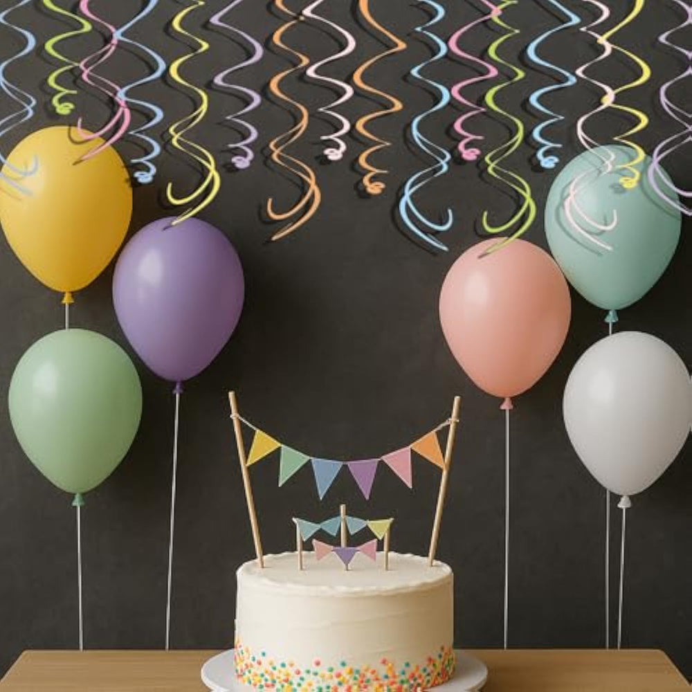 | Light Cheerful Color Mix – Features Soft Pastel Tones In Pink, Blue, Yellow, Green, Orange, And Lavender. These Vibrant Swirls Add Lively Motion And A Festive Pop Of Color To Any Indoor Party Space. | | Lightweight Yet Sturdy Materials – Made From 250Gsm Coated Cardboard That Holds Its Shape While Staying Lightweight. Designed For Long-Lasting Use Across Multiple Celebrations Or Seasons. | | Easy To Hang, Pre-Installed Hooks – Each Swirl Comes Ready To Use With A Clear Plastic Pin Attached—No Assembly Required. Perfect For Decorating Ceilings, Backdrops, Doorways, Or Photo Areas With Ease. | | Perfect For Any Occasion – A Fun And Versatile Addition To Gender Reveal Parties, Spring Events, Engagement Celebrations, Baby Showers, Or Home Décor. Adds Movement And Joy To Any Gathering. | | Generous 48-Piece Set – Includes 48 Swirl Decorations That Can Be Grouped In Clusters Or Spread Out To Cover Larger Spaces—Giving You Layout Flexibility For Different Room Sizes Or Party Setups. | |