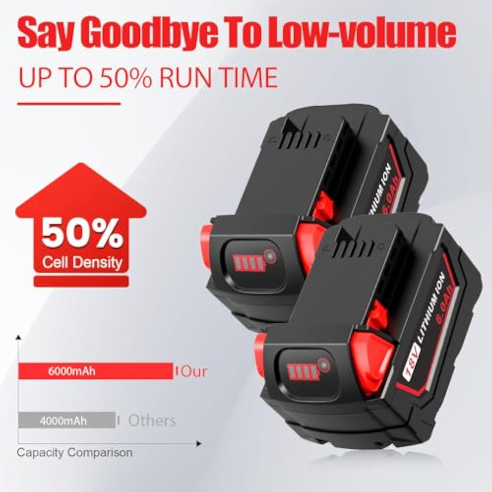Rpelacement Model Number: M18 Battery Replacement For Milwaukee M18 48-11-1811, 48-11-1815, 48-11-1820, 48-11-1822, 48-11-1828 , 48-11-1840, 48-11-1841, 48-11-1850, 48-11-1852, 48-59-181, 48-59-1850 | | 100% Compatible: 18 Volt Battery Compatible With Milwaukee M18 Cordless Lithium-Ion System Tools 2646-22Ct, 2643-21Ct, 2641-21Ct, 2646-21Ct, 2646-20, 2642-21Ct, 2641-20, 2729-22, 2629-22, 2729-20, 2729-21, 2629-20, 2706-22, 2705-20, 2705-22, 2704-20, 2787-22, 2702-20, 2701-20, 2656-22Ct, 2707-22, 2708-22, 2607-22, 2603-22Ct, 2601-21, 2615-20, 2602-22Dc, 2606-20, 2604-22Ct, 2706-20, 2704-22, 2788-22, 2702-22Ct, 2701-22Ct, 2707-20, 2708-20, 2607-22Ct, 2607-20, 2603-20, 2603-22, 2615-21Ct, 2615-21, 2606-22Ct, 2604-22, 2604-20 | | Longer Running Time: This 18V Battery Replace For Milwaukee M18 Has Improved To18V 6.0Ah, And Has Been Optimized In Terms Of Capacity Life, Reducing The Loss Rate, Which Can Better Extend The Use Time Of The Milwaukee Tool And Better Replace The M18 Tool B.