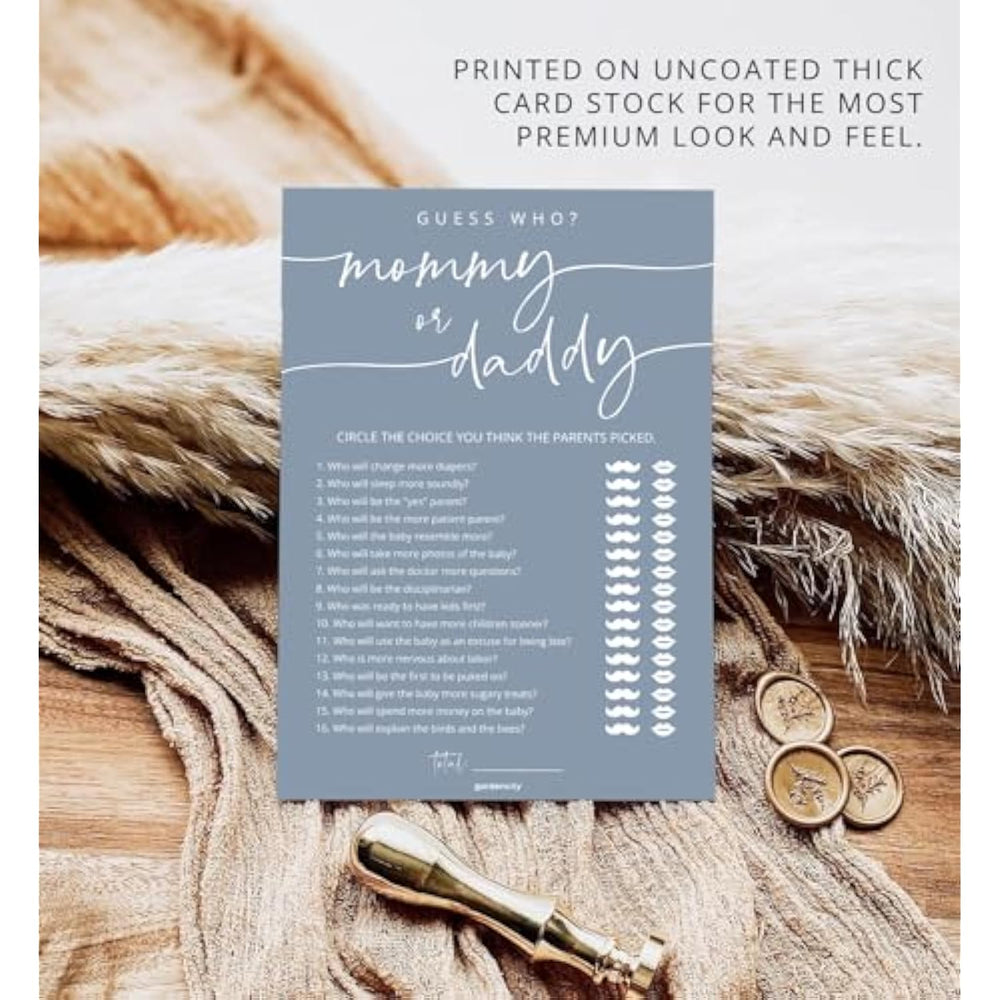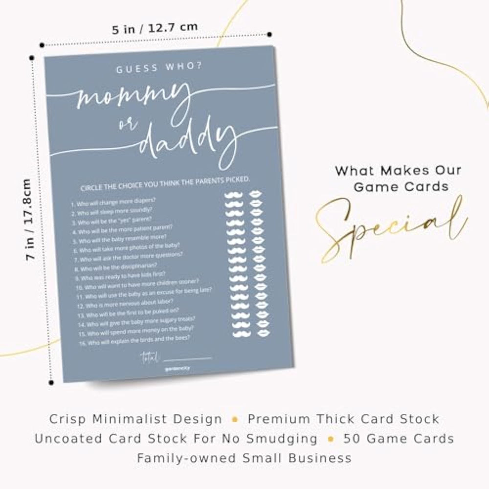 | Engaging Entertainment: Includes 50 Beautiful Game Cards That Spark Laughter And Create Unforgettable Memories For Your Baby Shower. | | Premium Quality: Feel The Difference With Our Cards Made From Extra-Thick Card Stock, Ensuring A Premium, Durable Finish That Match The Quality Of Your Event. | | Perfect Size: Each Card Measures A Perfect 5X7 Inches, Ideal For Easy Handling And Display. | | Instant Fun: Our “Mommy Or Daddy” Game Cards Come Ready To Play, Making It Simple To Bring Everyone Together For A Moment Of Laughter And Bonding As Guests Guess Who Did And Said What Between The Expecting Parents. | | Variations: Check Out Our Store For More Games And Ideas That Will Make Your Celebration One To Remember. | |